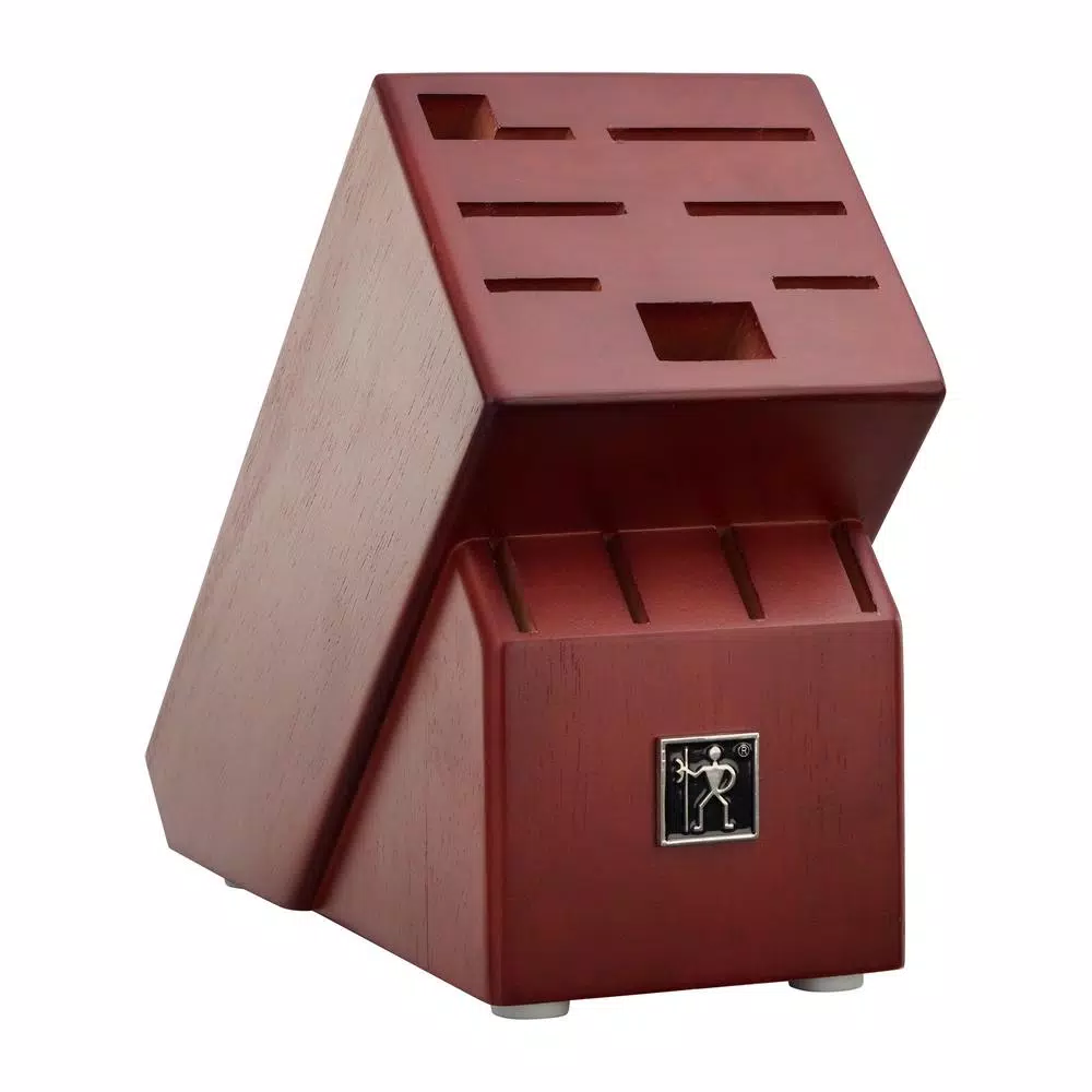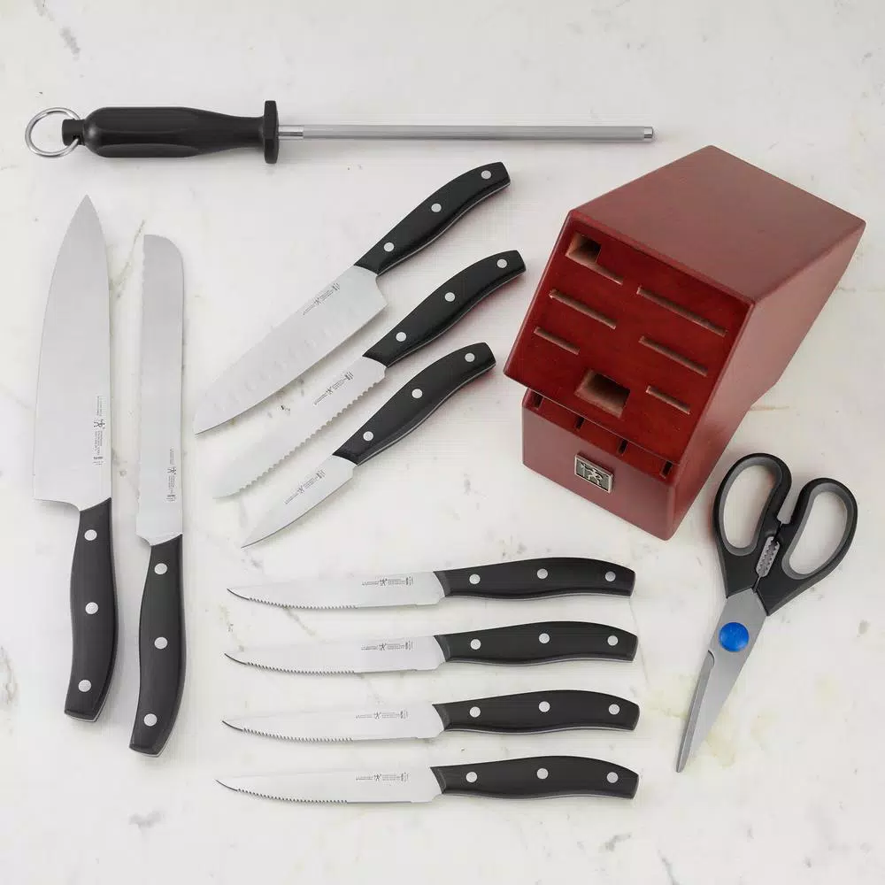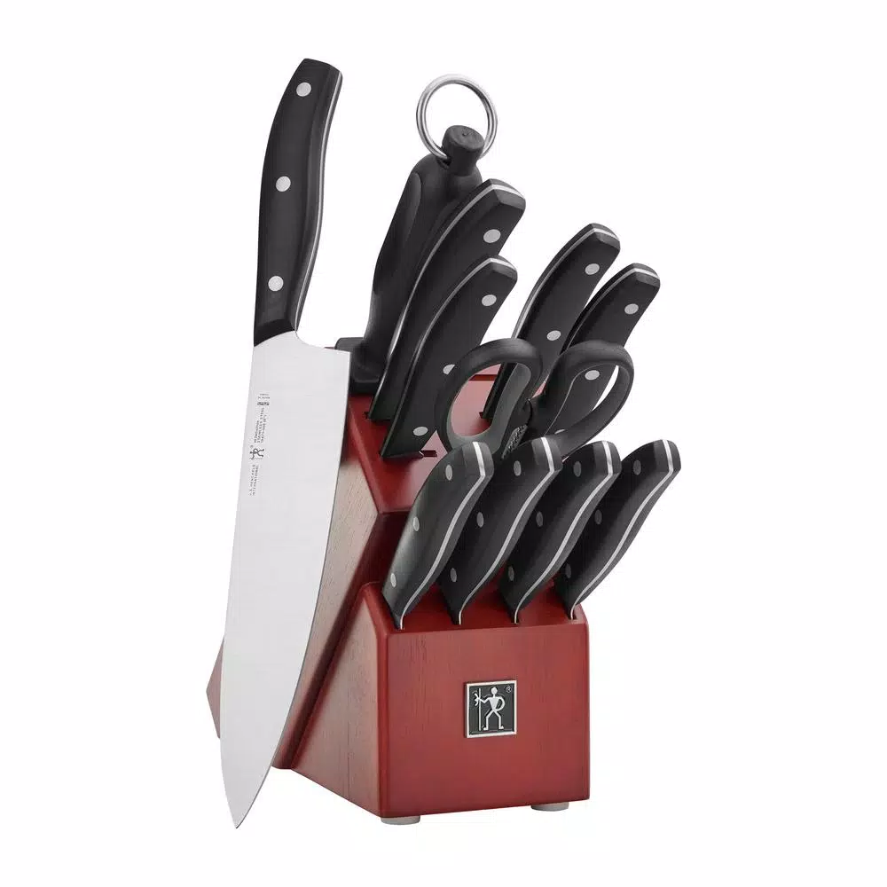 The Henckels International Definition 12-piece Knife Block Set is stocked with tools to tackle every kitchen task. The handsome hardwood block handily keeps this useful knife collection within reach on your countertop. Honed for long-lasting sharpness, the fine-edge blades boast precision cutting. The all-rounder 8 in. Chef’s Knife is perfect for chopping herbs and dicing onions while the 5 in. Serrated Utility Knife cleanly slices through tomatoes. Efficiently mince garlic with the 5 in. Hollow Edge Santoku, whose blade has small indentations, aka grantons, that prevent food from sticking while cutting.
