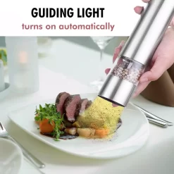 The iTouchless Electronic Pepper Mills/Salt Grinders (2-Pack) grind pepper and sea salts at the touch of a button. Your plate is illuminated by an automatic light when dispensing, and grinding is fully adjustable from coarse to fine textures.