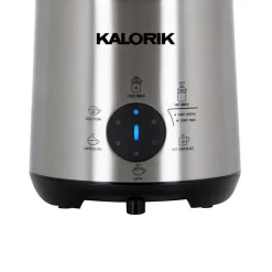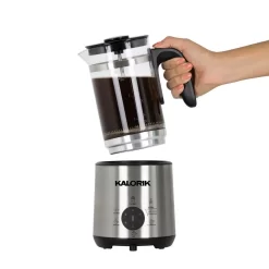 Meet your very own personal barista. This 8-in-1 beverage maker brings an authentic coffee shop feel into the comfort of your kitchen. The KALORIK Bartista gives you all the bold, flavorful benefits of a French press, with the versatility of an artisanal cafe. Make cold brew coffee or tea, hot coffee or tea, hot chocolate, cappuccinos, lattes and cold foam – at the touch of a button. This innovative electric French press features 6 one-touch presets for creating a wide variety of hot and cold barista-style beverages. A magnetic drive motor and frothing disc deliver rich and airy frothed milk, perfect for making cappuccinos, macchiatos, lattes, and hot chocolate. The special chocolate melting function allows you to add chocolate chips or chunks directly into the pitcher to make decadent hot chocolate. The stainless steel cage prevents the stirring element from getting clogged during melting. The Bartista comes with a removable glass pitcher and a French press accessory. A high-power heating element reaches up to 200°F. A 24 oz. brewing capacity yields 3-large servings of coffee, or 2-servings of frothed milk.