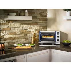 The KitchenAid KCO273SS 12 in. Convection Countertop Oven, in stainless steel, gives you full-size oven performance right on your kitchen counter with its large 12 in. oven capacity and 5 heating elements. Use your countertop oven for baking, roasting, broiling, keeping an already cooked dish warm, or toasting up to 6 slices of bread. Choose from 9 pre-programmed functions such as the Asado Roast function that precisely adjusts from high sear to optimal cooking temperature for superior roasting. The pizza function crisps the crust during the last 30 seconds of the cooking cycle for perfectly tasty results. The convection bake option reduces overall cooking time plus, Even-Heat technology provides consistent heat throughout the baking cycle for delicious results.
