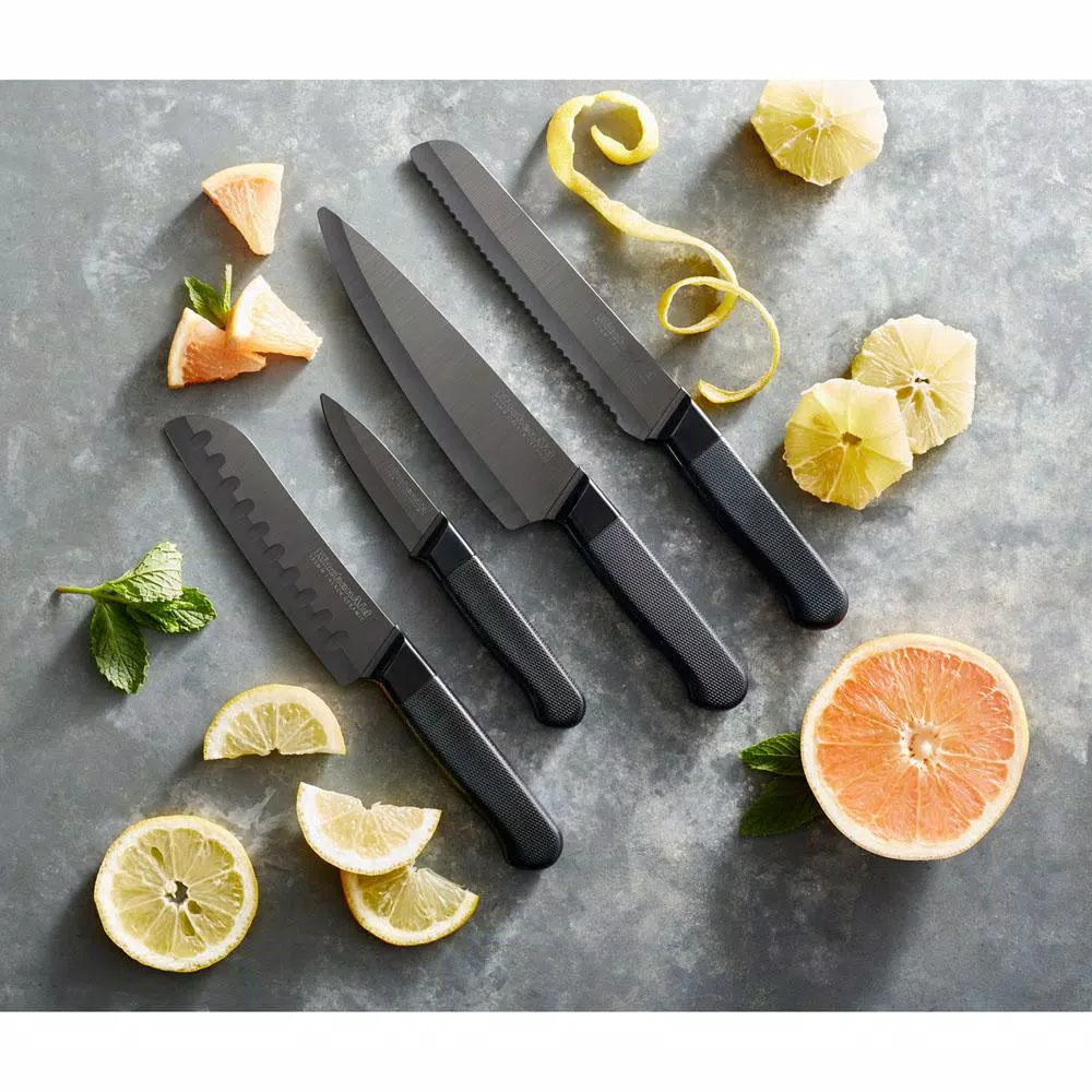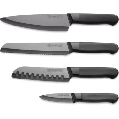 - Set includes 6 in. serrated bread knife, 6 in. chef knife, 3 in. paring knife and 5 in. Santoku knife