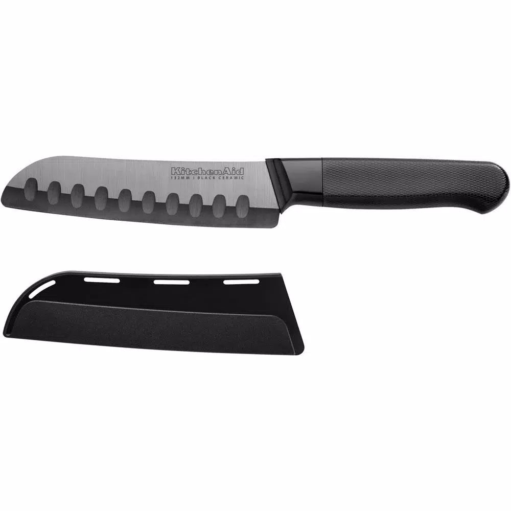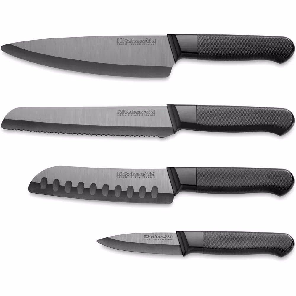 Stays sharp and is dishwasher safe – what more could you want from a knife. KitchenAid’s 4-piece ceramic cutlery set maintains its ultra sharp performance up to 10x longer versus stainless steel knives. Our pure ceramic knives wont rust or corrode from regular cleaning because they are free of metallic ions. The advanced material and technology that goes into our ceramic blades makes them second only to diamond in hardness so they are extremely wear resistant. The cutting edge of each of our ceramic knives is thoughtfully designed from tip to heel, giving you control throughout every step of your meal preparation. The handles are properly weighted to feel like stainless steel knives yet have the superior sharpness of a ceramic knife. Hard plastic blade shields are included to keep knife edges clean and provide convenient scratch-free drawer storage. Plus they slip on and off in seconds, making instant blade protection hassle free.