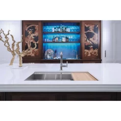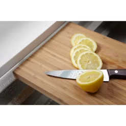 This bamboo cutting board is custom-designed to sit securely on the basin ledges of the Prolific kitchen sink. Use it as a convenient work surface for prepping foods directly in the sink. It features a one-year limited warranty.