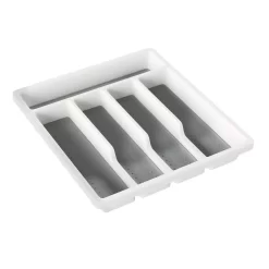 Keep your kitchen neat and organized with the 5-Compartment White Silverware Drawer Organizer by Lavish Home. This divided tray organizer is made of polypropylene plastic with a non-slip rubber liner to keep your forks, spoons, knives and other utensils neatly separated and in place. It also features 4 nonslip rubber feet to keep the tray from sliding around in the drawer. It has 5 different compartments to help fit your storage needs. This organizer is also great to use in your office, bedroom or bathroom to keep office supplies, jewelry and make up organized and easy to access.