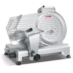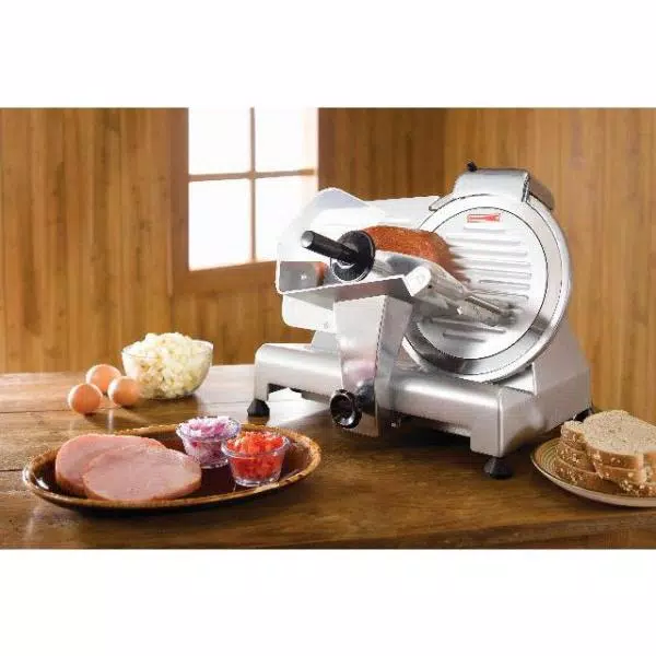 Perfect deli cuts of your favorite boneless meats are always within reach thanks to this heavy-duty commercial grade slicer. Finely honed blade rarely needs to be sharpened, even with frequent use. Sharpener is included for when it comes time for sharpening. To adjust thickness, just turn the graduated knob. This slicer will slice as thin as 1 mm or as thick as 10 mm (0.4 in.) and any thickness in-between. Auto shut off feature for added safety. Replacement belt and replacement blade sharpening stone included. Note: Not suitable for slicing frozen foods or non-food items. ETL Certified.