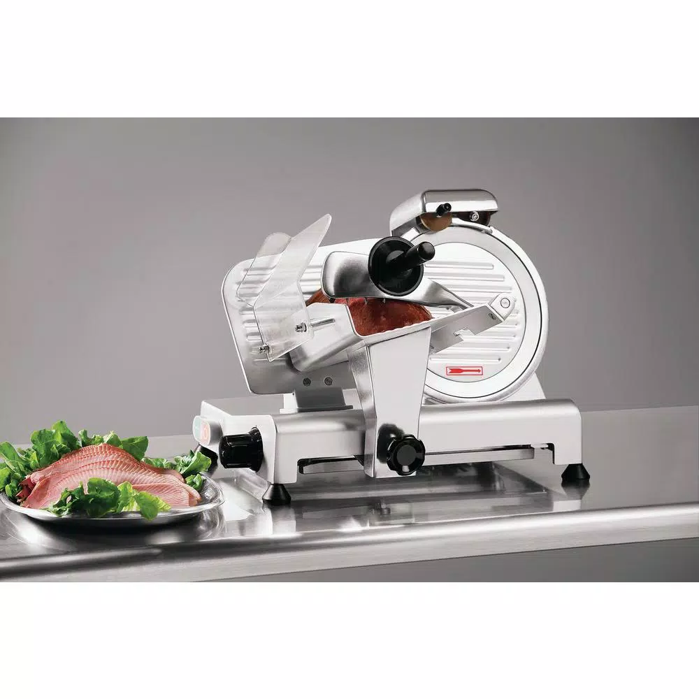 - Sliding Carriage and Food Holder Arm Ensure Consistently Smooth and Precise Cuts