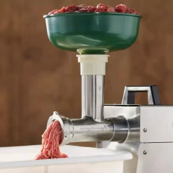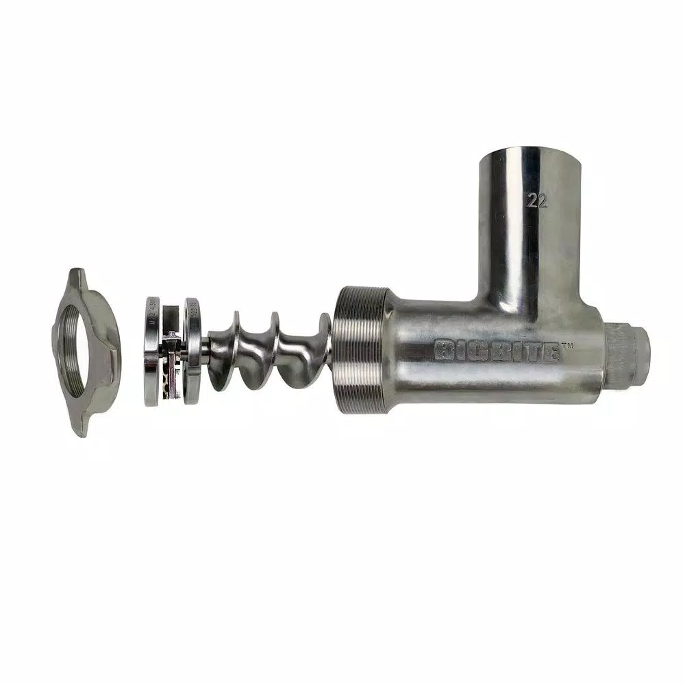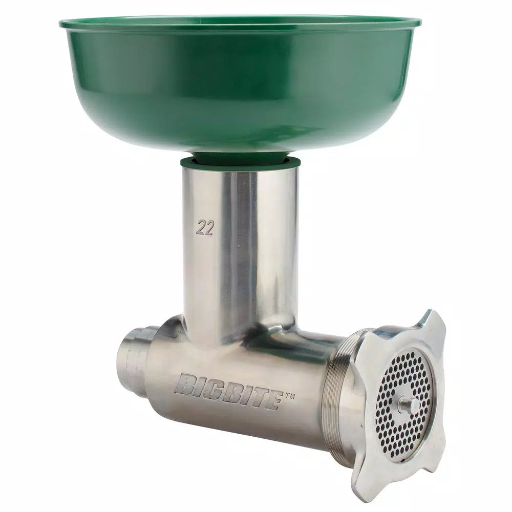 Save time with 2-grinds in one pass. This stainless-steel Big Bite Grinder attachment works with the #22 1HP and #32 1.5HP motor. This attachment will grind 10-11 lbs. per minute. This technology has been used in commercial processing but we are bringing it to the home processing world. The double edge grinding knife and 2-grinding plates will produce the consistency of a 2-grind process in one pass through the grinding head. This attachment includes the exclusive Big Bite technology that allows the auger to take an extra big bite of meat and then move it through the grinder quicker than other grinders and now grinding twice with one The #22 is for use on the #22 and #32 LEM grinder motor Save time with 2-grinds in one pass. This stainless-steel Big Bite Grinder attachment works with the #22 1HP and #32 1.5HP motor. This attachment will grind 10-11 lbs. per minute. This technology has been used in commercial processing but we are bringing it to the home processing world. The double edge grinding knife and 2-grinding plates will produce the consistency of a 2-grind process in one pass through the grinding head. This attachment includes the exclusive Big Bite technology that allows the auger to take an extra big bite of meat and then move it through the grinder quicker than other grinders and now grinding twice with one pass getting a premium grind in half the time.