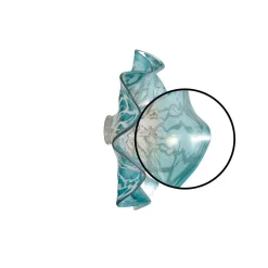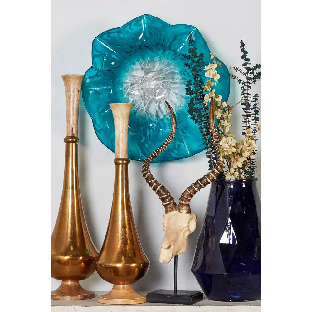 This glass wall plate features wavy rims and scalloped edges that will add a delicate touch to your wall. It is adorned with gradated aquamarine hues and veined gray highlights for a soothing and elegant look. The round glass wall mount ensures safe and easy hanging of the plate on any wall surface.