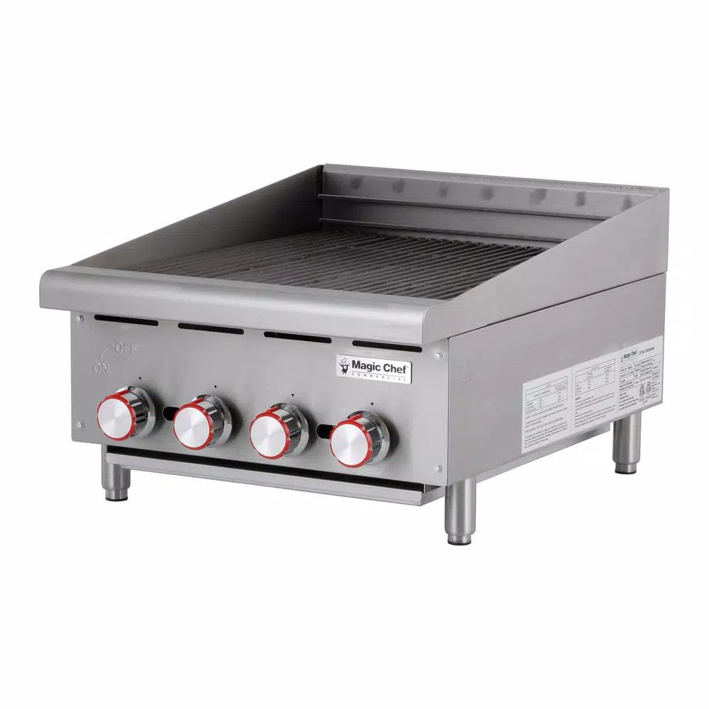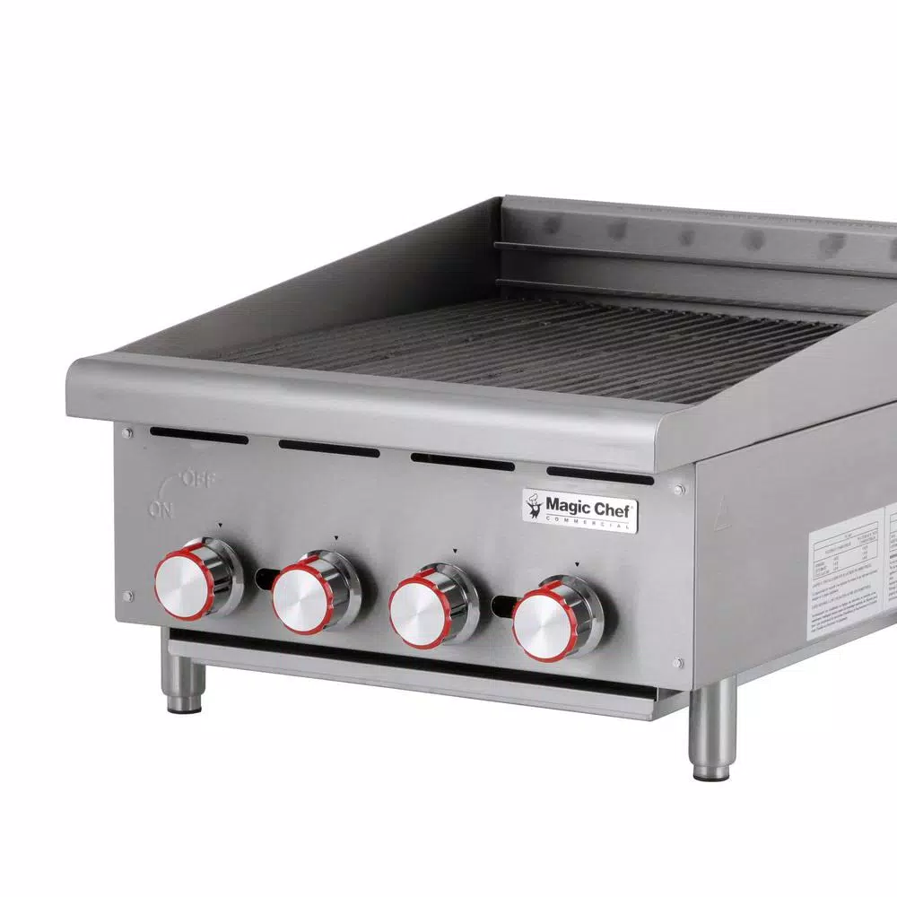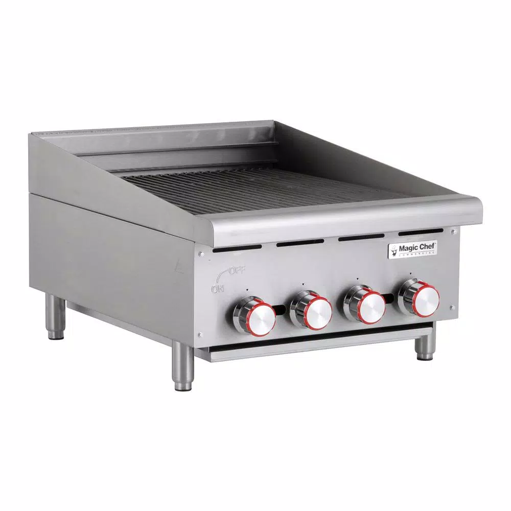 The Magic Chef Commercial 24 in. wide Char broiler lets you prepare delicious grilled foods in your restaurants. It provides 24 in. cooking space depth with it is (4) burners set every 6 in. for better efficiency. Burners are cast iron and feature built in deflectors. The adjustable inline grate is reversible for increased versatility. Grill grates are also heavy duty cast iron. The stainless steel body is built for durability and features a bull nose front edge. It is comfort grip knobs are heavy duty chrome plated, and it is standing pilot allows for quick ignition.