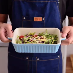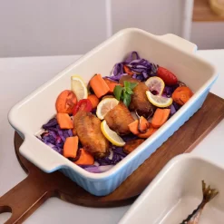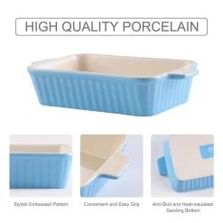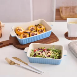 There is no denying the fact that delicious food is one of the most prominent weakness of everyone. A plate full of exquisite dishes is something which people even dream about in their sleep. And if you are foodie then what to say more, food lovers don’t eat to live. Rather they live to eat delicious food or dishes. So exquisite bake ware pans are important part to their attention. Rectangle blue porcelain baking pans including 9 in. and11 in. bake ware pans. porcelain Bake dishes at different sizes and functions fit for most food in daily life.