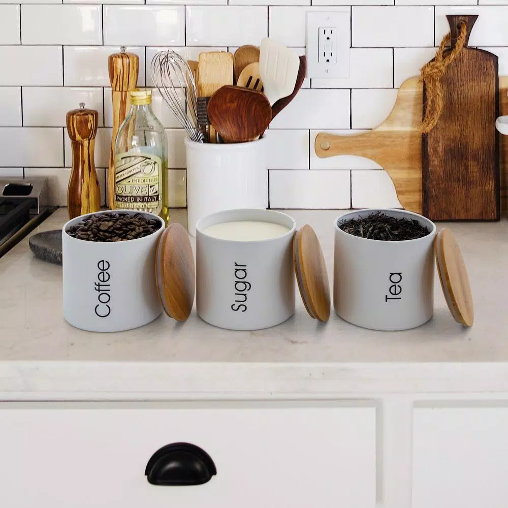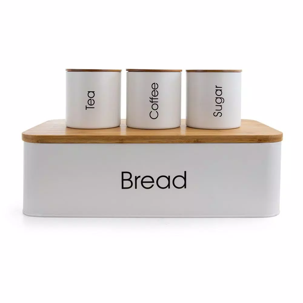 Preserve the freshness and quality of your food with the MegaChef Bamboo Kitchen Countertop Containers Set. Featuring a bamboo lid that includes an air tight rubber ring, ensuring your food will be kept fresh for weeks to come. Each canister is crafted of metal with a white finish throughout and can hold up to 2.5 cups of your favorite coffees, teas, and sweeteners. Bread box is also ideal for keeping your fresh breads just as fresh as the day you put them in. Each container has a matte white finish and is labeled for your convenience. Bamboo lids on each storage jar is easy to care for, wipe clean when needed. The lid on the bread box also serves a multi function, use it as a cutting board and a serving tray. This MegaChef Kitchen Storage and Organization 4 Piece Canister Set was conveniently designed with you in mind.