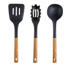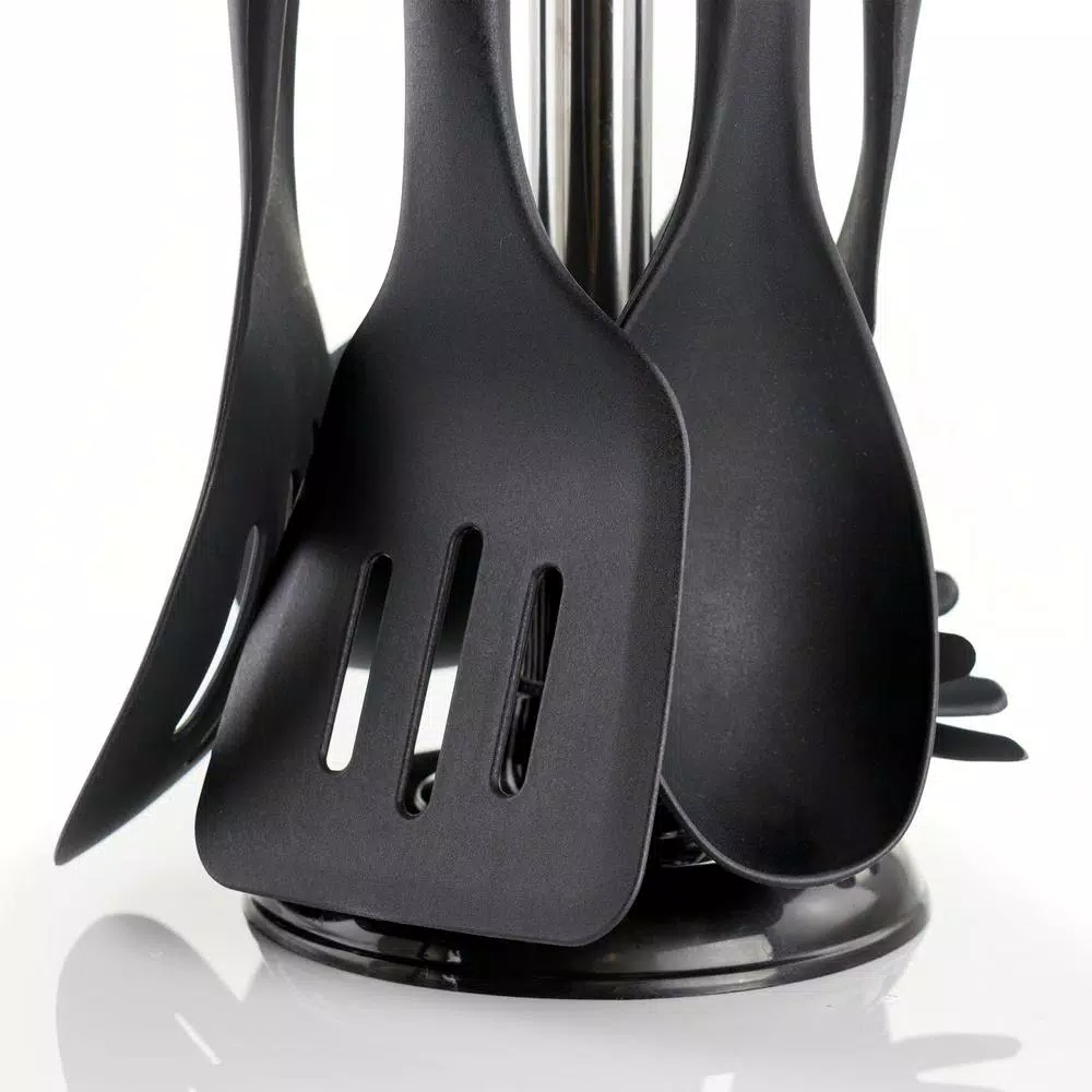 - Includes: slotted spatula, cake/omelet turner, soup ladle, spoon, slotted spoon, pasta spoon, rotating stand