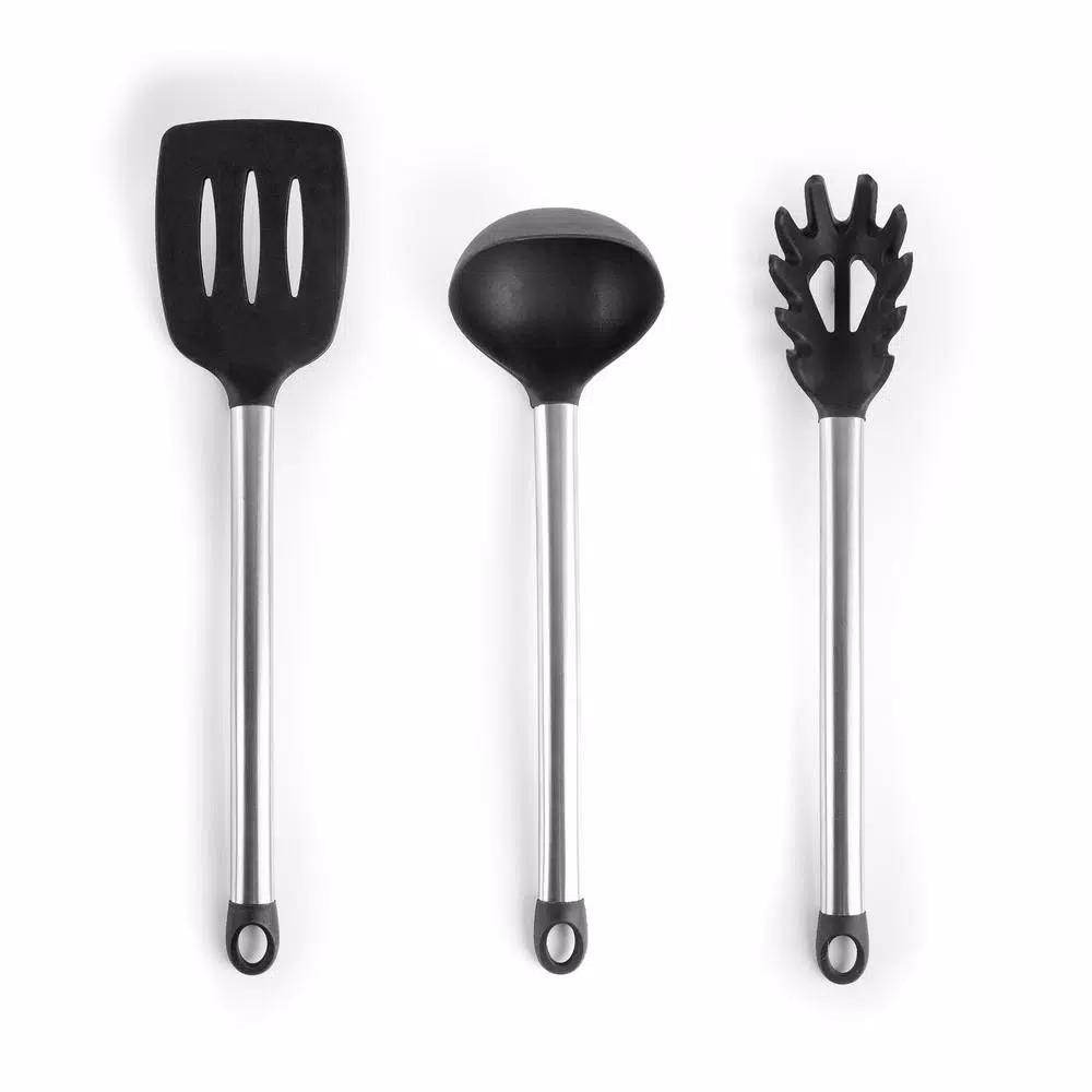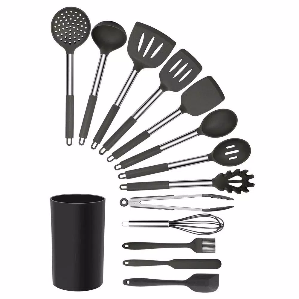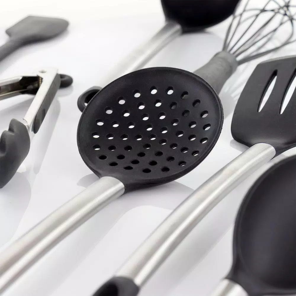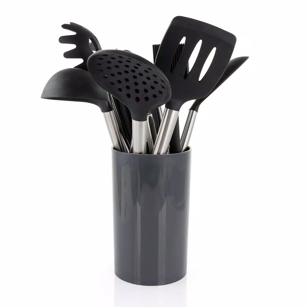 - Includes: whisk, pasta spoon, turner, spoon, skimmer, 9 in. tong, brush, spatula, long spatula, chinese slotted turner, slotted turner, slotted spoon, ladle, plastic canister