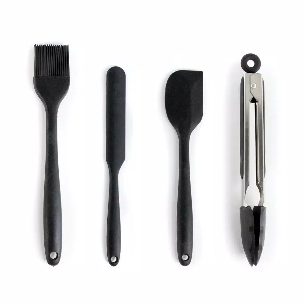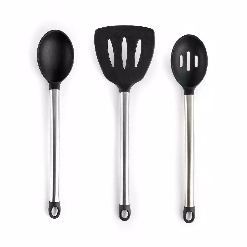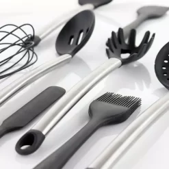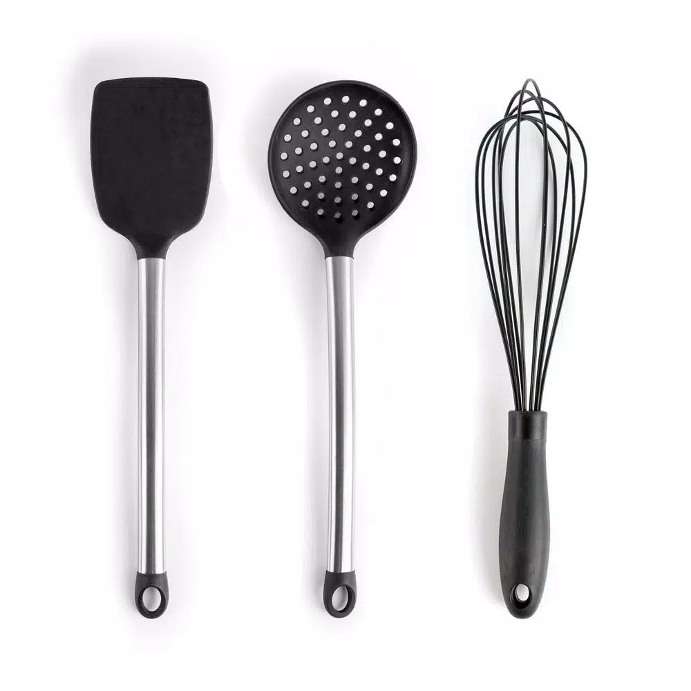 - Includes: whisk, pasta spoon, turner, spoon, skimmer, 9 in. tong, brush, spatula, long spatula, chinese slotted turner, slotted turner, slotted spoon, ladle, plastic canister
