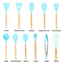 - Includes: ladle, spatula, turner, spoon, slotted turner, slotted spoon, pasta spoon, spatula turner, brush, whisk, 9 in. tong, plastic canister