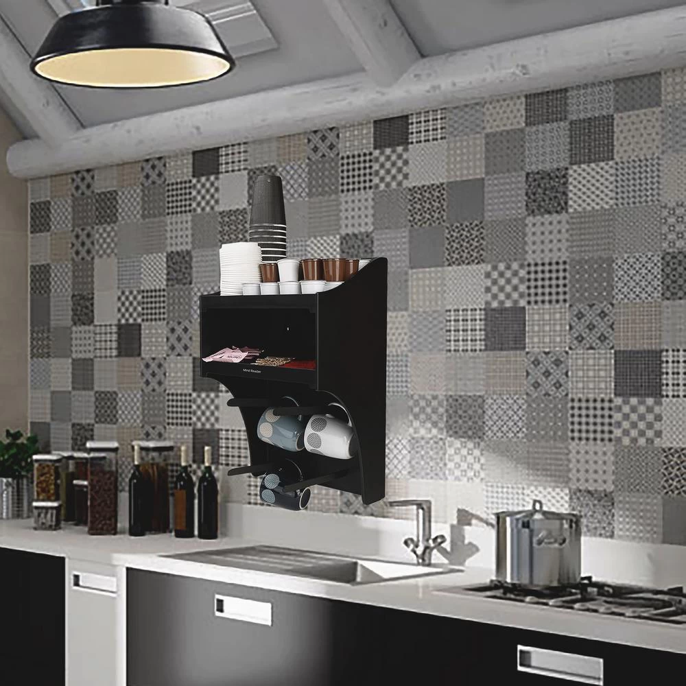 - WALL MOUNTED COFFEE/TEA ORGANIZER: Hang this all-in-one condiment storage organizer with 2 shelves and 4 coffee mug hooks for hanging your favorite coffee/tea or hot cocoa mugs – withstands up to 25 lbs. of weight.