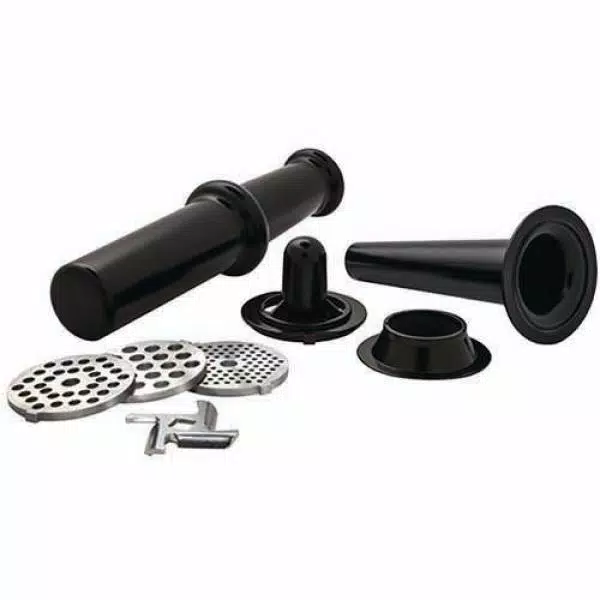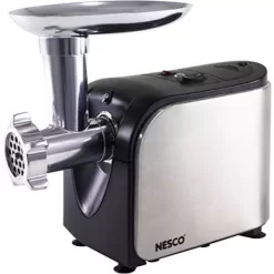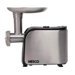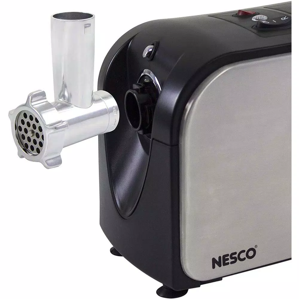 The Nesco FG-180 Food Grinder lets you make your own variety of sausages, ground meat, sandwich spreads, relishes, pates and appetizers. A powerful 500-Watt motor, stainless steel cutting blade and three grinding plates offer a choice of fine, medium and coarse grinding plus shredding. Easy-to-operate reverse function allows auger rotation to safely dislodge blocked food. The unit features a stainless steel body and storage box, metal gear box and gear shaft with an easy to remove grinder head. The included sausage stuffer and food pusher fits conveniently inside storage box.