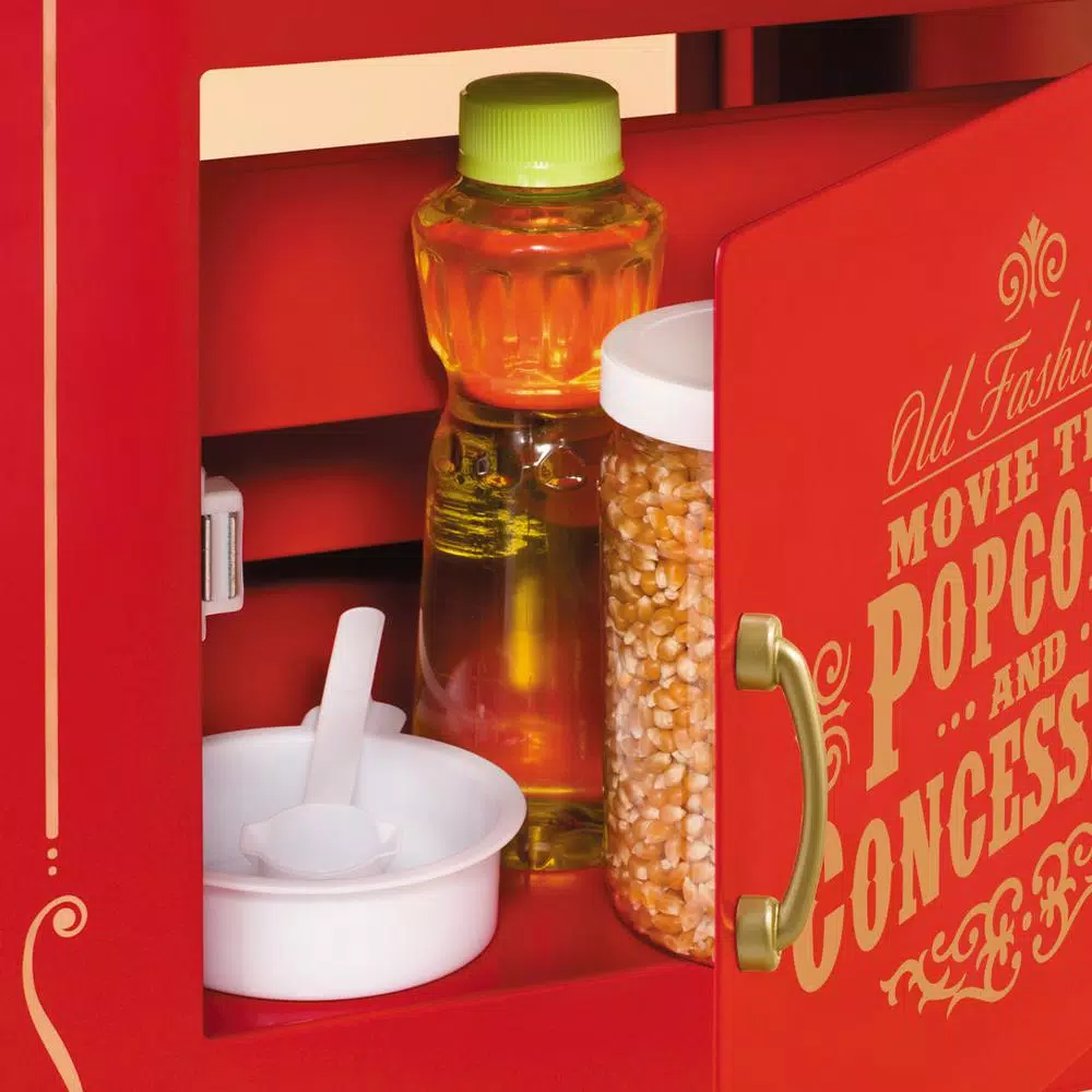 The Nostalgia CCP610 59 in. Tall Commercial 8 oz. Kettle Popcorn and Concession Cart has a distinctive vintage look reminiscent of the silent movie houses and carnivals of the early 1900s. Featuring a large 8 oz. kettle with built-in stirring system, this unit pops the most delicious popcorn every time. The tempered glass windows and door, along with interior light lets everyone watch each delicious kernel pop to perfection. The convenient utility shelf is perfect for popcorn preparation. Keep candy in the LED lighted concession stand and keep all your popcorn essentials on hand in the convenient storage compartment. If space is an issue, the top is removable for countertop use.