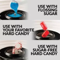 - Flossing sugar or hard candles: unique extractor head allows you to use traditional flossing sugar or your favorite hard candies to make delicious cotton candy