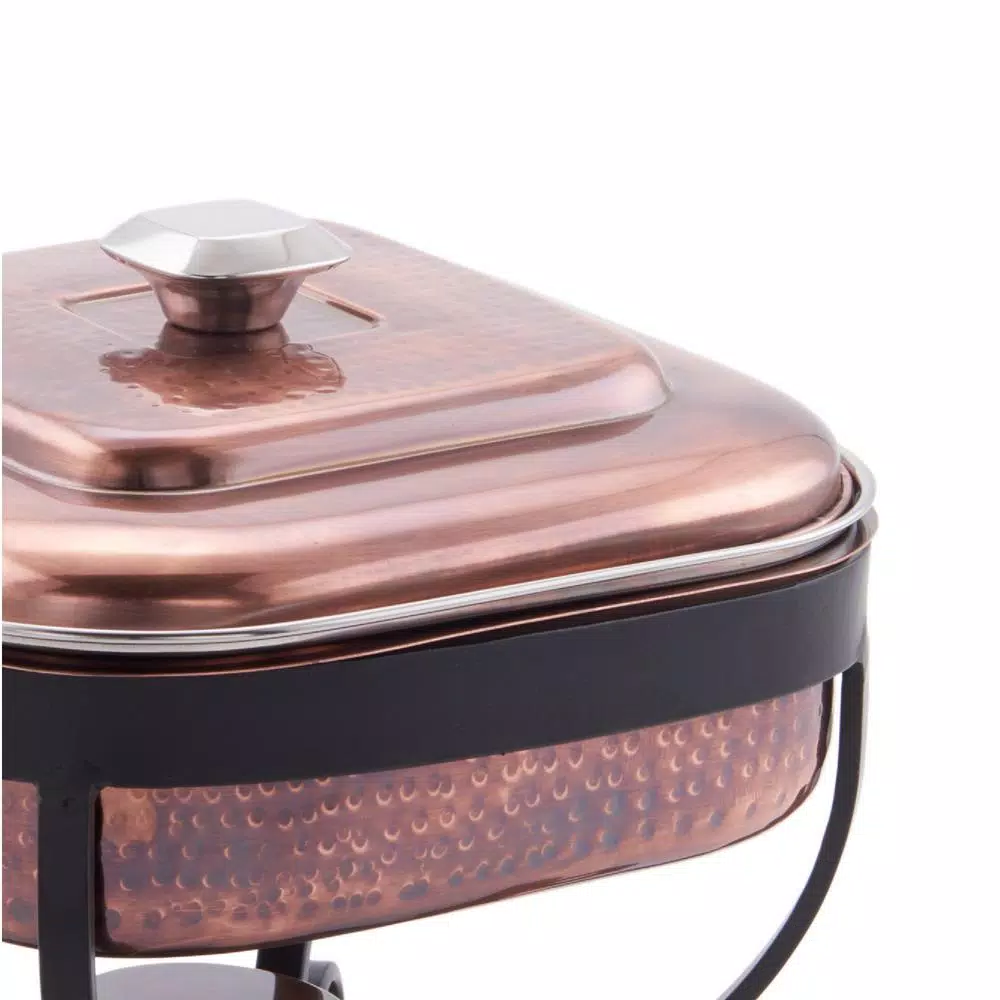 3 Qt. Square Hammered Antique Copper Chafing Dish with Stainless Steel Spoon. 3 Qt. Stainless Steel food pan is oven safe to 350°F, water-bath design keeps food at the perfect serving temperature without drying out. Includes Sturdy Iron stand. Adjustable fuel holder takes standard “Sterno” type gel fuel canisters (not included).