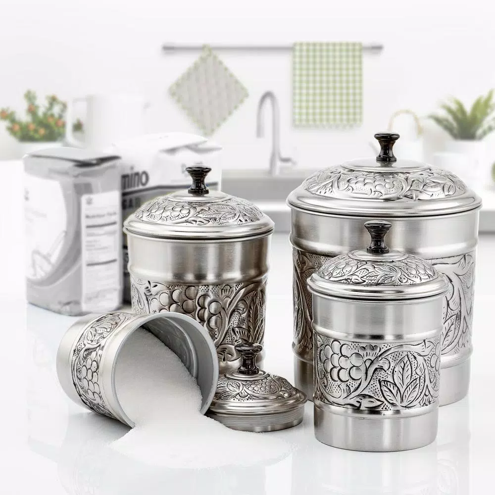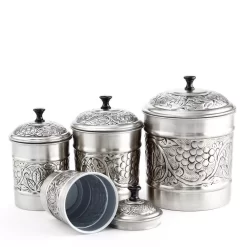 4 Piece “Antique Pewter Heritage Canister Set. There’s plenty of style and storage in this 4 Piece Canister set, The beautifully chased Grapevine motif is handcrafted by skilled artisans, making each an individual work of art, Durable construction with a rich Antique Pewter Finish. Generous 1 Qt., 1 Qt., 2 Qt. and 4 Qt. capacities.