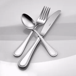 A strand of graduated beads embellishes the border of Pearl. This refined flatware offers continental sizing and unequaled durability, making it suitable in both American and European decors. This flatware set is made of 18/10 Stainless Steel and is dishwasher safe.