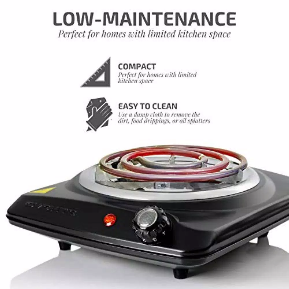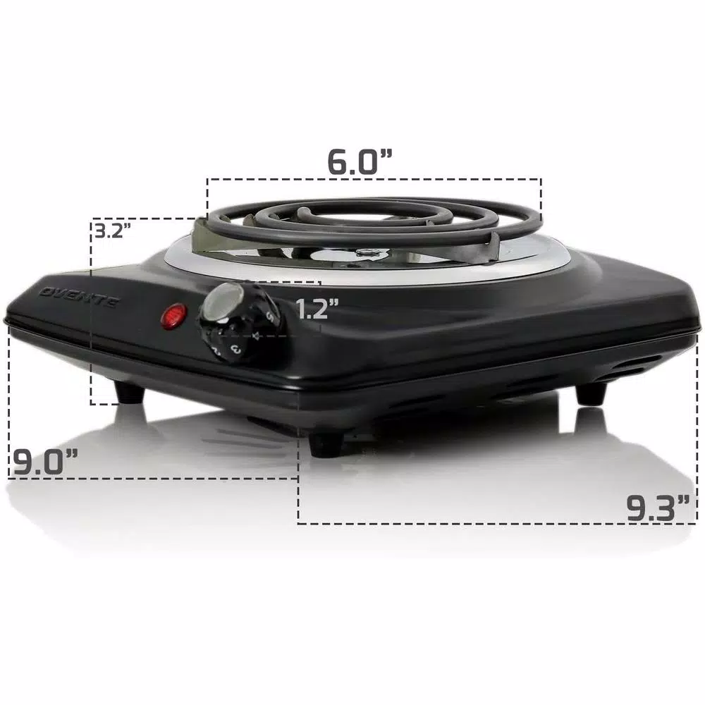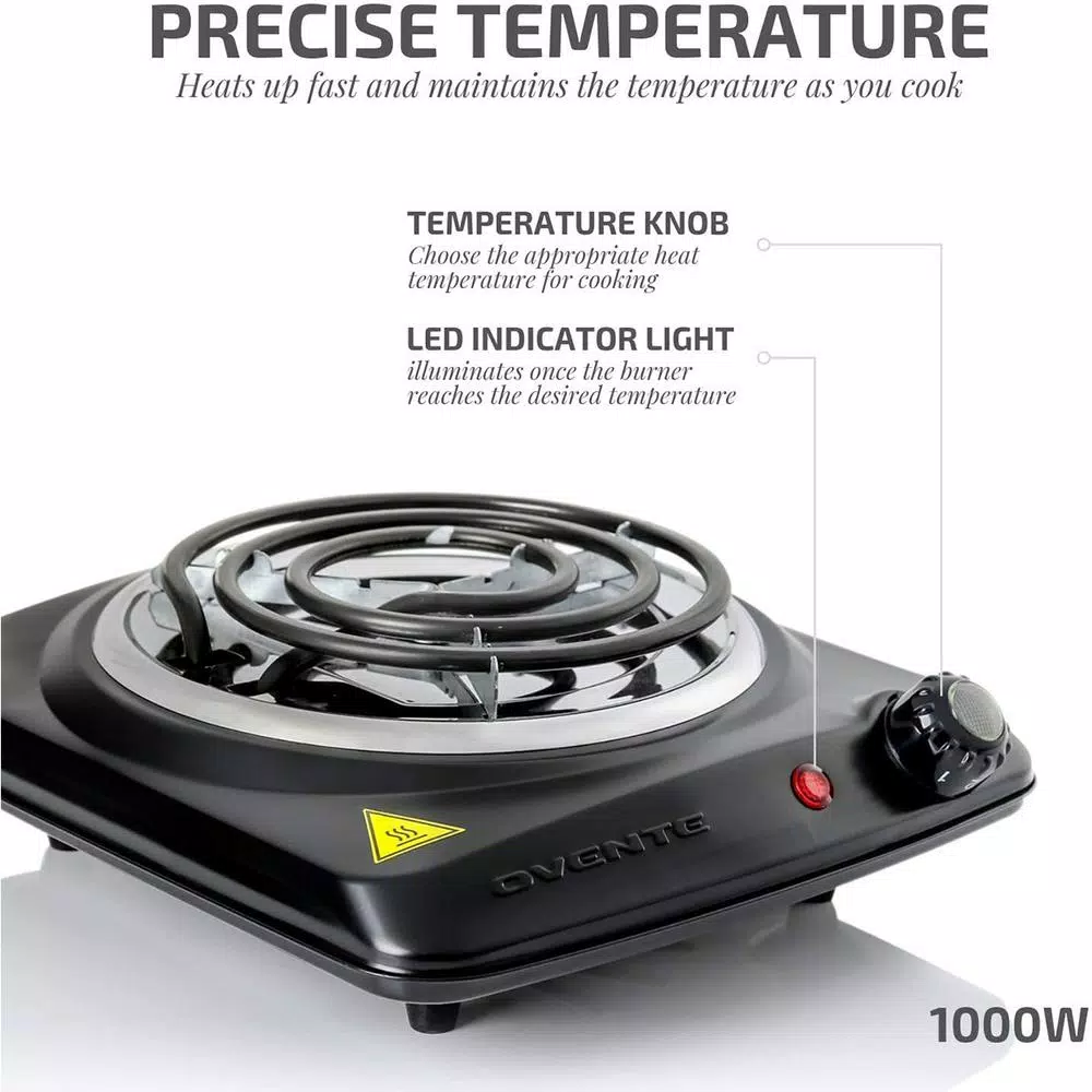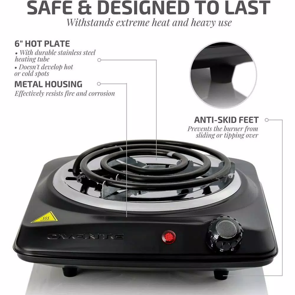- Makes cooking a stress-free task – The Ovente Electric Single Coil Burner BGC101 Series is equipped with a 6-inch hot plate with durable stainless steel heating tube powered by 1000 Watts (120 Volts) of power. Unlike other burners, this one heats up quickly and cooks food evenly without any hot or cold spots.