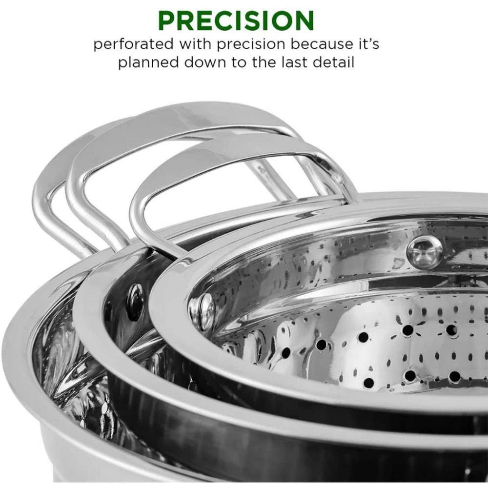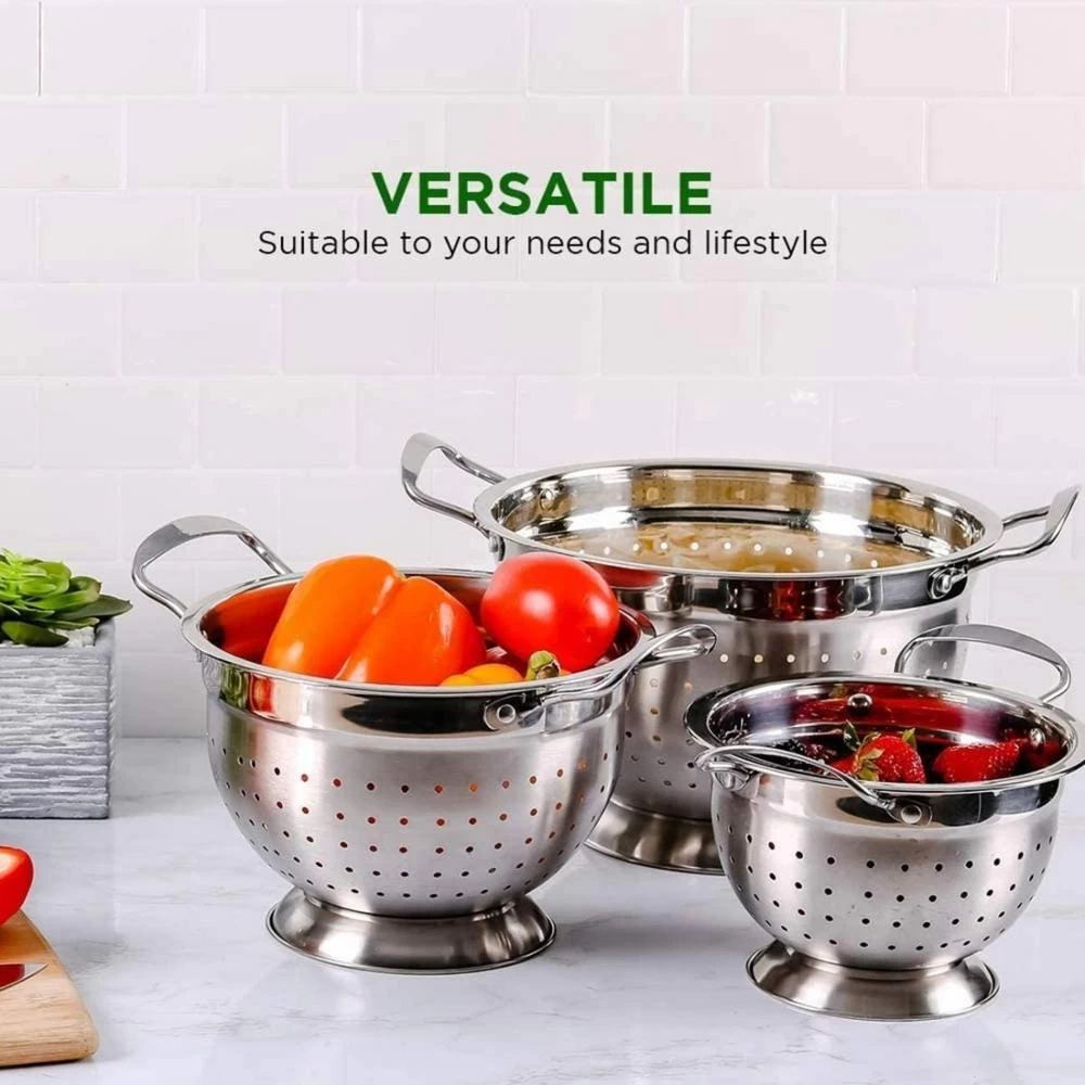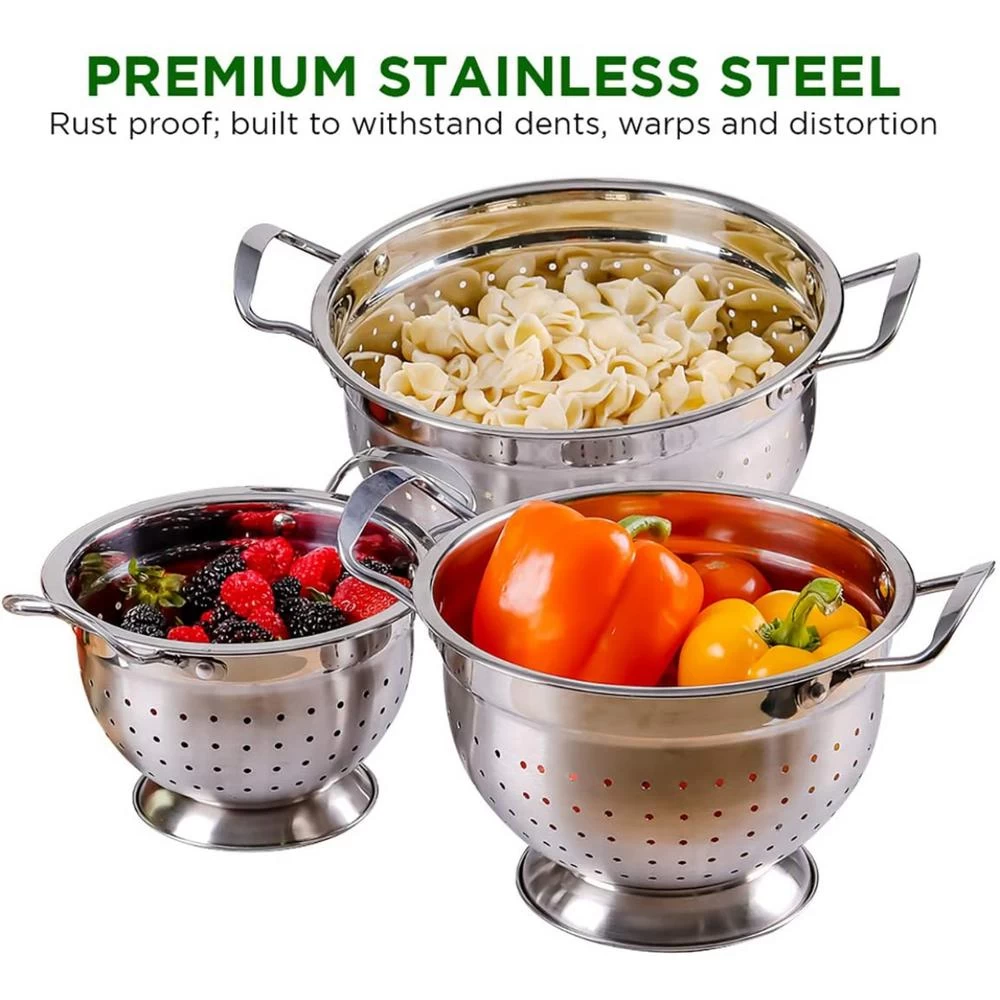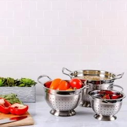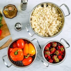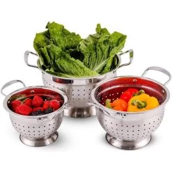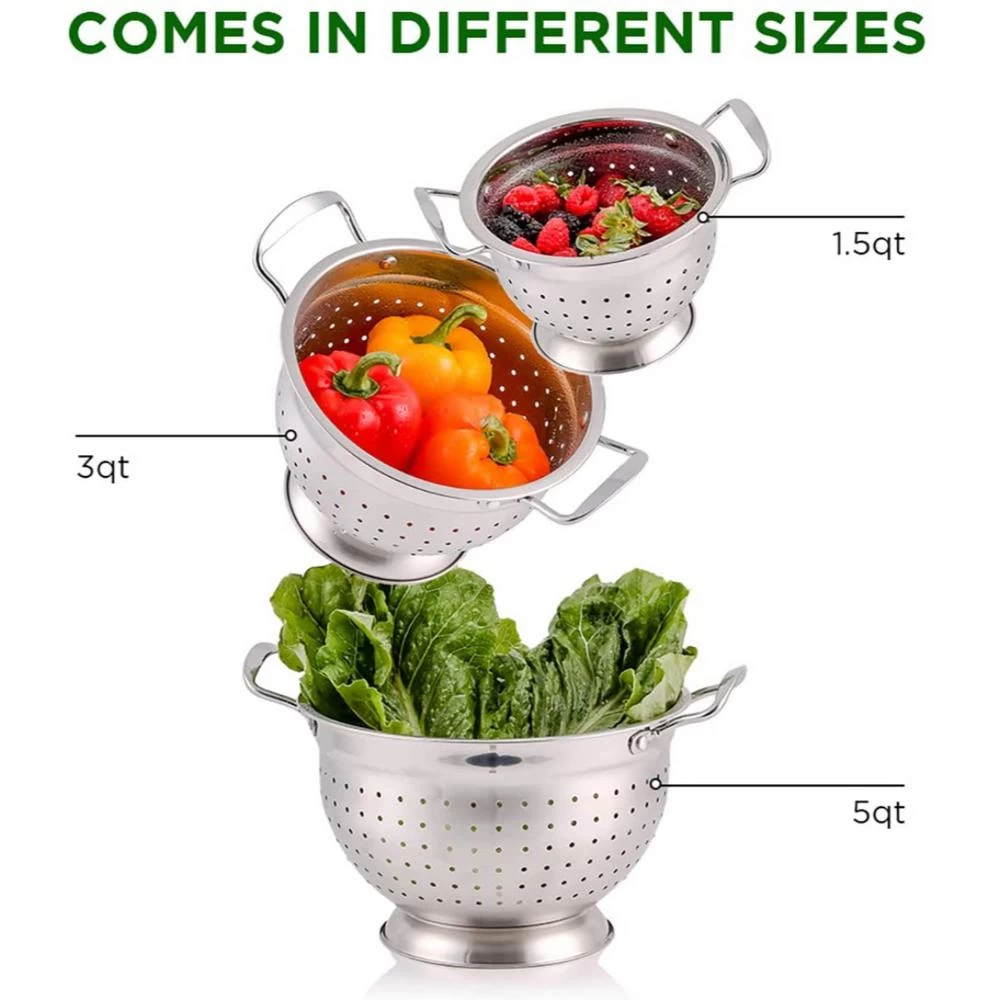 - Variety – A 3-piece colander set with 1.5qt, 3qt and 5qt sizes; fear not for there’s plenty of capacity.