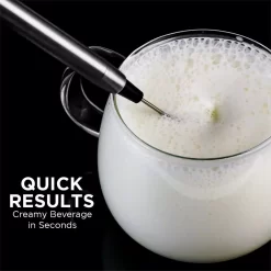 Gone are the days when your Coffee lacks pizzazz! With the Ovente electric stainless steel milk frother, sitting with a cup of Coffee will never be the same again. Enjoy extra froth with your Coffee at any time of the day; It s amazing how a thick layer of bubbles sitting atop your Coffee can brighten your morning, to make those rainy days brighter. No need to worry about unnecessary wires hooked to your electric milk frother, because this little gem only needs 2 AAA batteries to whisk up a bubbly beverage. And It s super simple to use; with its one-hand operation, All you need is a push of a button to make your Coffee a dream of milky, thick froth. The design is sleek and sophisticated, and easily complements any kitchen. The smooth metal chrome Finish makes it a classic piece with a luxurious flare. Unlike other electric milk frothers, this one is lean and easy to store, because we believe in maximizing your space. But then again, there s more to it than just sprucing up your Coffee with a dose of thick, creamy milk. It s about the small details that remind us of better days. Choose Ovente, because we understand that those minute details remind us of better days that last a lifetime.