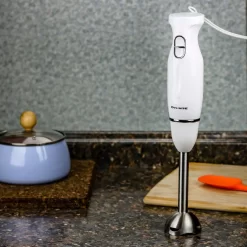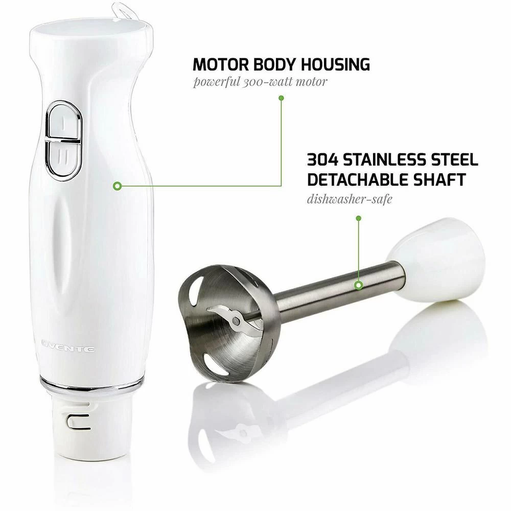 Witness ease convenience and versatility at work—right in your own kitchen. Discover a new world of innovative cooking possibilities with the Ovente HS560 Handheld Immersion Blender It makes blending and mixing any soft foods a pleasure because it makes it SO easy and effortless that it might even be fun! Its lightweight body along with its ergonomically-designed non-slip handle is so comfortable to hold and control that cooking won’t ever feel like a chore again. Whip up all of your favorite gourmet soups guacamole smoothies/shakes cake batter salsas sauces marinades salad dressings or even homemade baby food for your precious bundle of joy with just one press of a button Powered by 300-Watts and a heavy-duty motor it works quickly and effectively—expertly mixing anything you desire into a smooth evenly-mixed medley of mouth-watering flavors. Its Slim-Stick design enables this hand blender to fit into any mixing bowl pot beaker or cookware without restriction It’s compact enough to fit anywhere but powerful enough for the toughest blending jobs It was also carefully designed to come apart easily so that clean up and storage is no problem Simply take apart then hand wash the shaft or place into the dishwasher and let dry. The body can simply be wiped clean with a soft damp cloth. NOTE TO PREVENT OVERHEATING OPERATE THE HAND BLENDER IN ONE MINUTE INTERVALS OR LESS