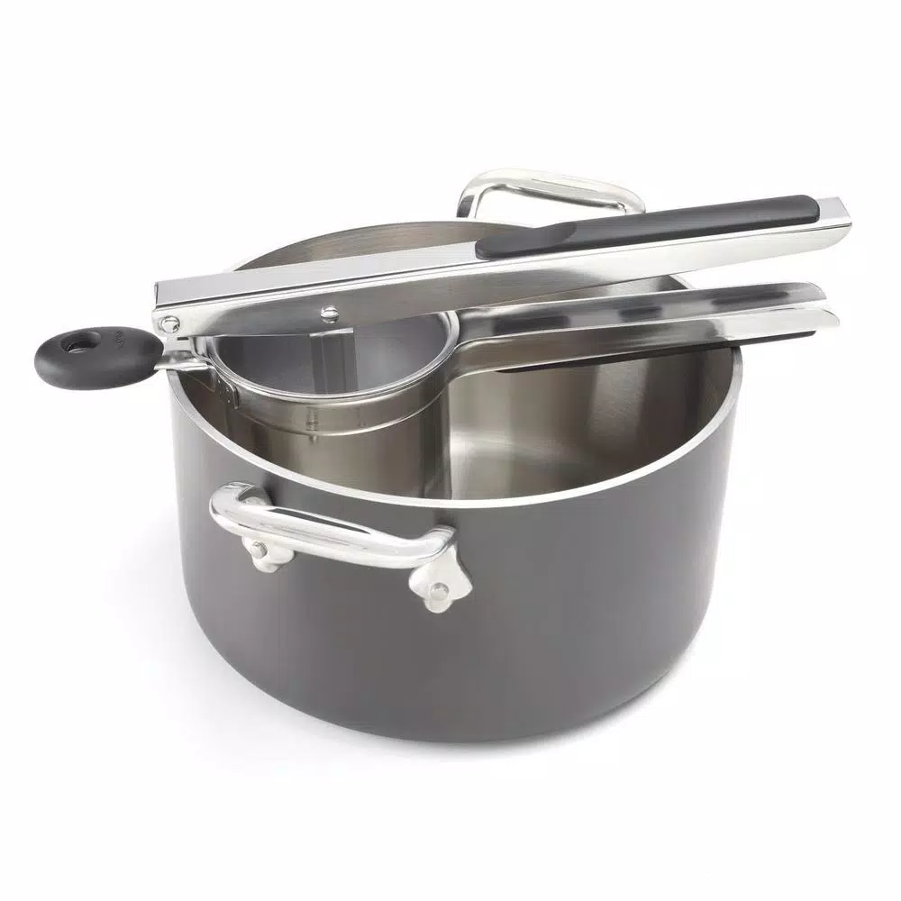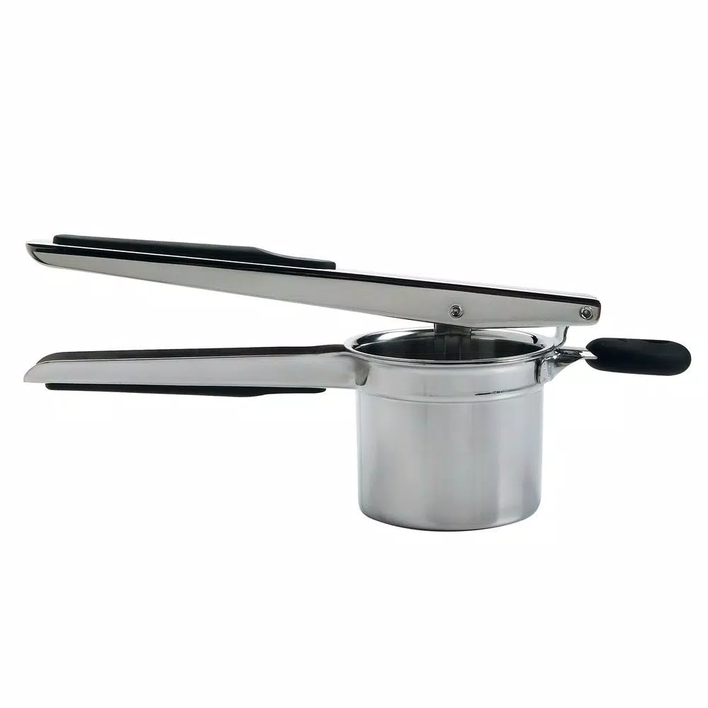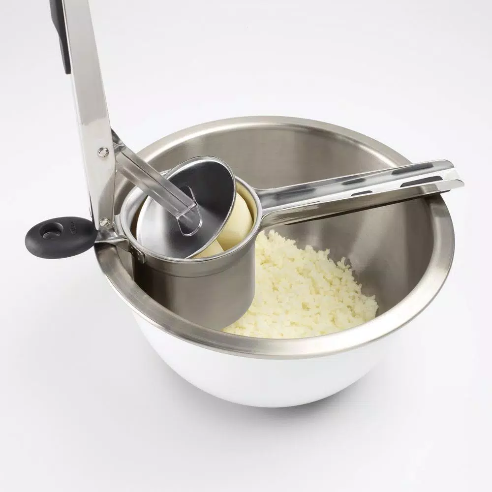The OXO Potato Ricer is the secret to perfect mashed potatoes. This easy-to-use ricer rests securely on bowls for leverage when pressing foods. Squeeze the soft handles together for perfectly mashed fruits and vegetables.