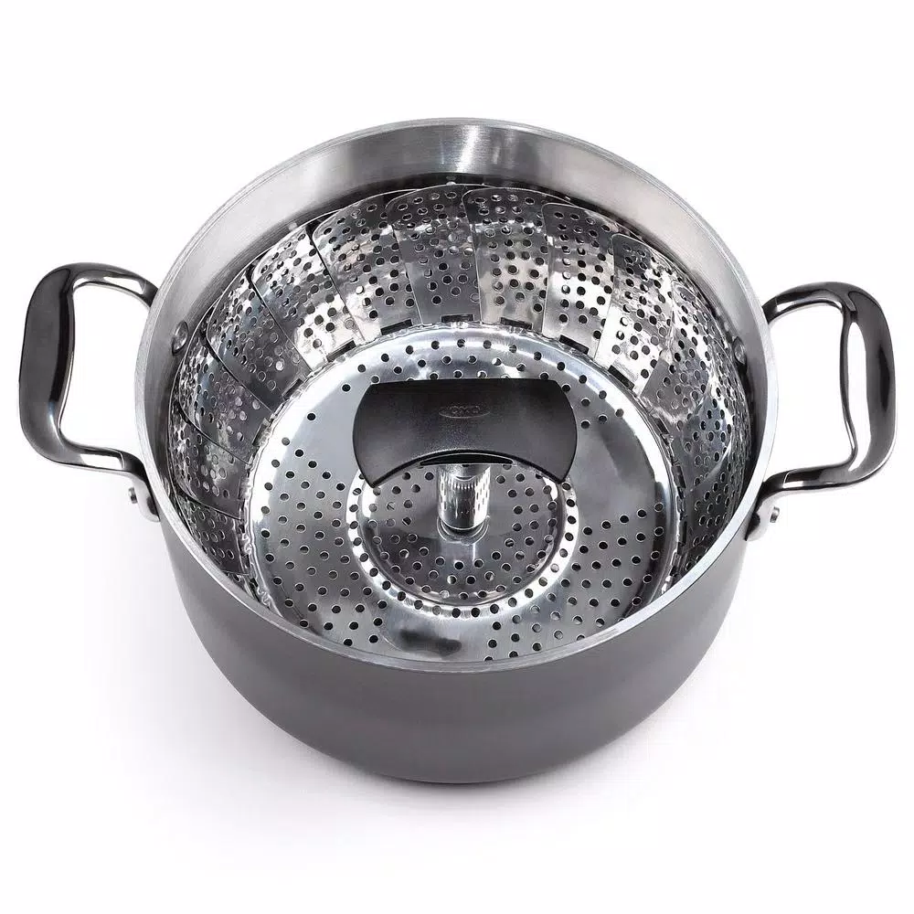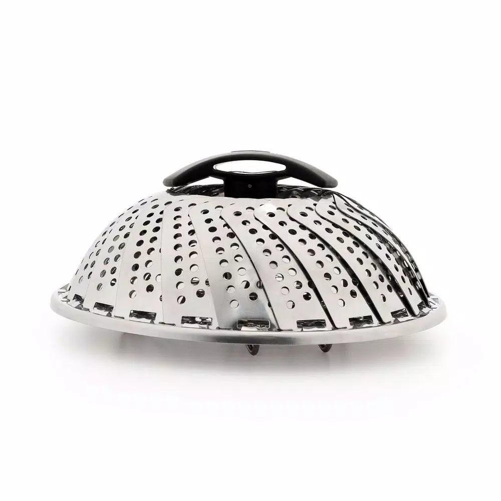 With a simple pull of the Stainless Steel Steamer’s telescoping handle, it extends to provide added length, making it easy and safe to use in hot pots. Press the handle again to lock it down and fold feet in for compact storage. For even more reach, a fork can be inserted into the handle. Steamer works well in most pressure and multi-cookers. No kitchen is complete without this vegetable steamer.
