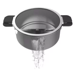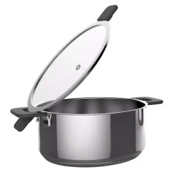 Designed to outperform on electric, gas, infrared, inductive, glass, ceramic and traditional stoves, the Ozeri 6-Piece Stainless Steel Inductive Pot Set with Straining and Hands-Free Glass Lids both enhance and simplify the cooking experience. This versatile 6-piece set includes an uncompromising 4.5 l (4.8 Qt.), 2.7 L (2.9 Qt.), and 1.3 l (1.4 Qt.) stainless steel pot, each with accompanying glass lids, that stack together into the large pot for space-saving utility. The Ozeri pots are made of commercial-grade 18/8 SS304 stainless steel with tri-ply construction for enduring performance that resists discoloration and prevents unwanted reactions with food. Each pot includes a matching adaptive glass lid with an integrated steam vent and heat-resistant silicone-coated handles. These innovative lids easily rotate from a tight seal that retains moisture, nutrition and flavor, to a measured opening for effortless straining without the use of a separate colander. In addition, the patent-pending Ozeri lids stand freely when inserted in the pots specially designed side handles, creating a unique hands-free configuration that obviates the need for counter space or that third hand when stirring, cooking or serving. Made for a lifetime of satisfying use, each pot boasts a brushed interior, polished exterior, and a magnetized impact-bonded base for unrivalled heat conductivity, distribution and retention, thereby eliminating hot spots. Ships with a limited lifetime warranty.