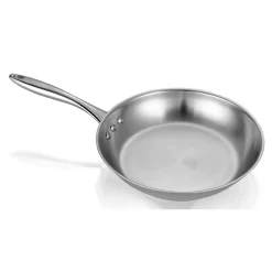 Featuring 3-Ply stainless-steel construction and a triple-riveted stainless-steel handle that stays cool to the touch, the Stainless Steel Earth Pan by Ozeri achieves a restaurant-quality experience without sacrificing durability. Designed to withstand the most demanding cooking tasks with low maintenance, the stainless-steel cooking surface always maintains its color and luster, even when cooking foods that are highly alkaline or acidic. The Stainless Steel Earth Pan by Ozeri is crafted from the highest quality 18/8 stainless-steel for enduring performance, efficient heat conductivity and a cooking experience that is entirely free from hot spots. Made for the experienced chefs who prefer to hand season the surface of their pans before cooking, the restaurant edition of the Stainless Steel Earth Pan is PTFE and PFOA-free and compatible with all cooktops, allowing you to saut, fry, sear, brown, boil or braise without concern over altered flavors. Sporting a polished mirror exterior that resists both scratches and dents, the pan also boasts a magnetized bottom for rapid heat transfer on induction stoves. Additional features include sloped walls for easier tossing and flipping and a beveled rim for cleaner pouring. Made to withstand the test of time, the Stainless Steel Earth Pan is oven and broiler-safe up to 500°F (260°C), 100% dishwasher-safe and offers a professional-level cooking experience that maximizes flavor. Your satisfaction is guaranteed.