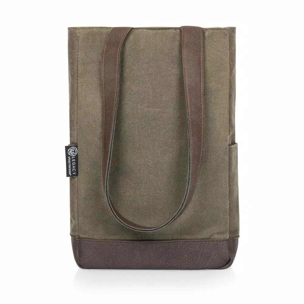Insulated wine and cheese tote with 2-compartments for wine. Constructed of a waxed cotton canvas and soft pebbled leatherette that’s durable yet stylish. Measures 12 in. height and has a interior bag width of 3.5 in.