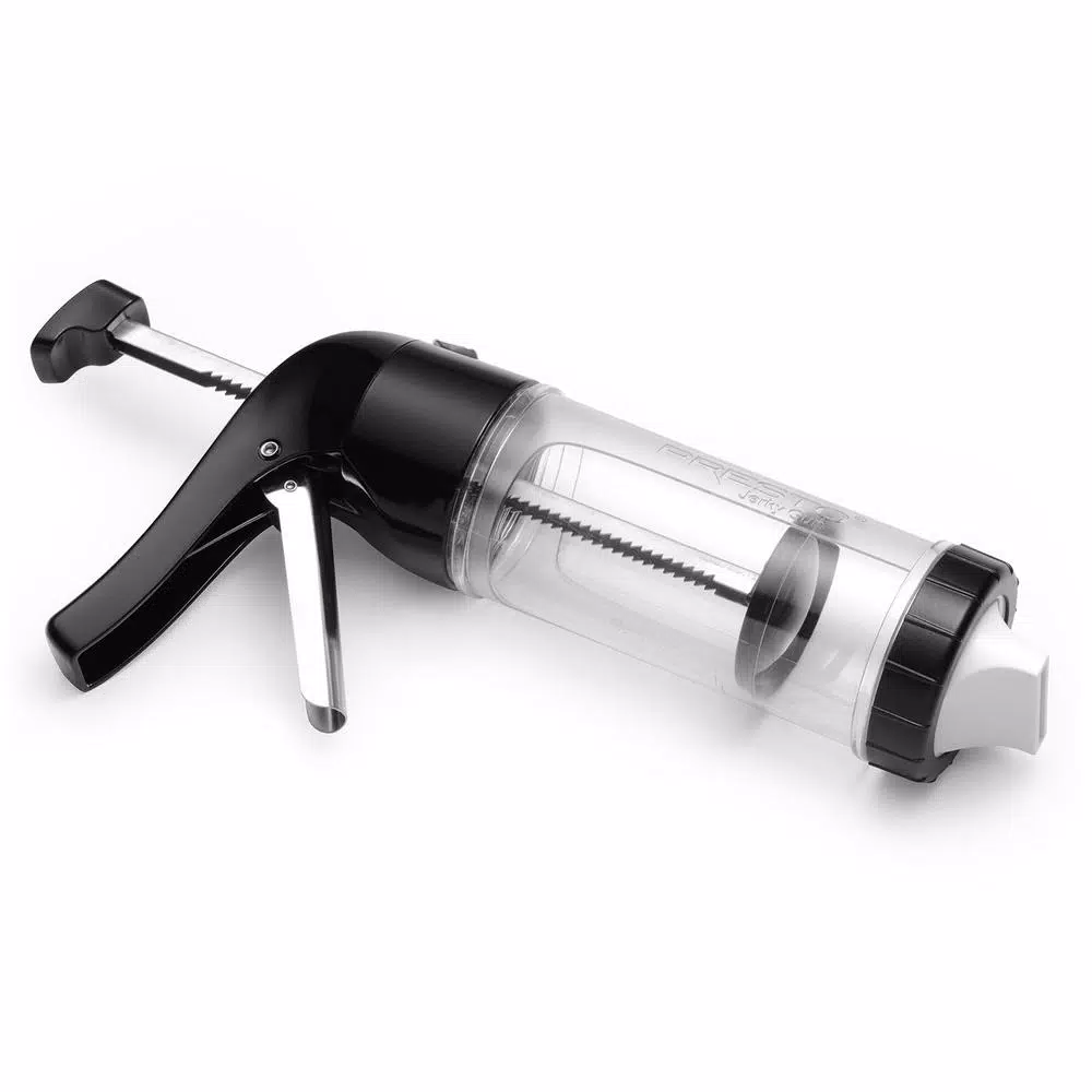 Make great-tasting homemade jerky from seasoned ground beef, venison and other meats. Includes three interchangeable nozzles for making jerky in wide strips, dual strips and round sticks. The wide, easy-to-load chamber holds 1 lb. of seasoned ground meat. Jerky Gun and nozzles are dishwasher safe.