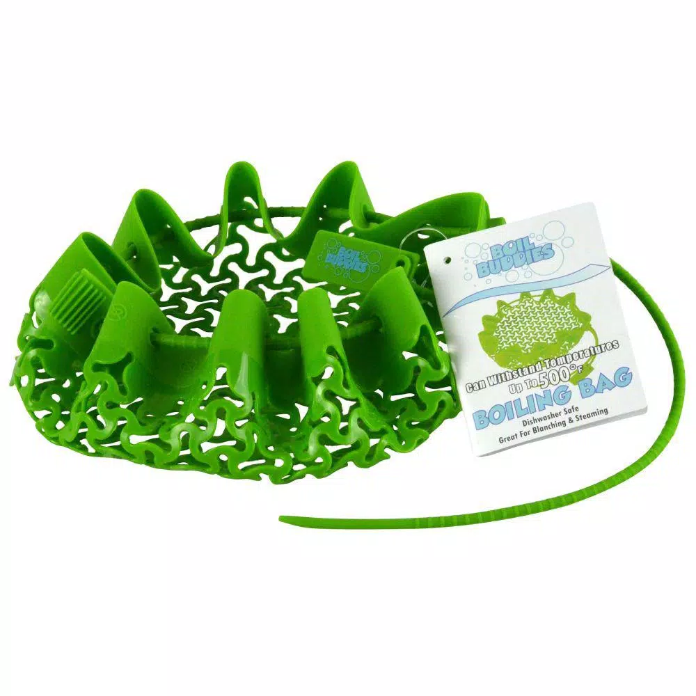 This Boil Buddies by Southern Homewares brand Silicone bag makes an excellent addition to any kitchen arsenal. Simply place the desired food in the Boil Buddies Boiling Bag and pull the draw string tight. Then place the bag and it’s contents in the pot of boiling water and cook till done. Once the food has cooked the perfect amount, easily remove the bag by the drawstring and you’re done. We suggest using pot holders to remove the bag and watch out for hot steam. Bag is green in color. When laid out completely flat the bag has a 12 in. diameter.