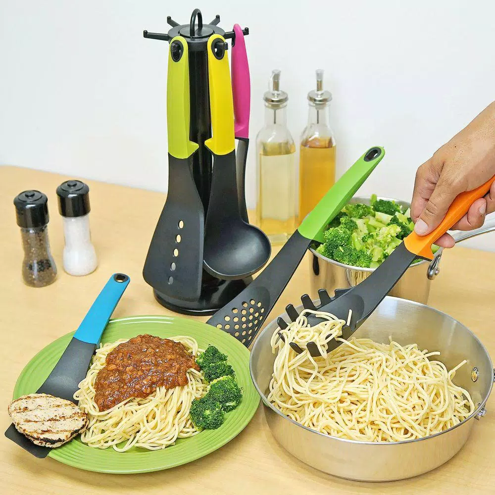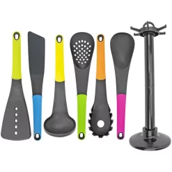 If you’re looking to fill out your kitchen drawers with all the tools needed for food prep and cooking, then you need this Kitchen Utensil Set from Southern Homewares! This set includes a spatula, ladle, spoon, turner, spaghetti server, skimmer, stirring spoon, and holder to store them all. Each utensil is made of durable, melt-proof plastic, which allows you to use them for any cooking activity. They also all have a hole at the base of their handle for easy hanging storage on the included holder, as well as colorful handles to add a bit of fun to your prep time! Whether you’re baking, meal prepping, or cooking dinner, you will no doubt be glad you have this utensil set. Order now and be sure you always have the right tool for the job on hand while in the kitchen! Stirring spoon (pink handle) measures 12.50″ x 2.75″ x 0.90″. Skimmer (dark green handle) measures 12.50″ x 2.90″ x 0.90″. Spatula (light green handle) measures 12.50″ x 3.50″ x 0.90″. Turner (blue handle) measures 12.50″ x 1.95″ x 0.90″. Ladle (yellow handle) measures 12.00″ x 3.65″ x 3.40″. Spaghetti server (orange handle) measure 12.00″ x 2.65″ x 2.85″. Holder measures 14.75″ x 5.00″. Some assembly required.
