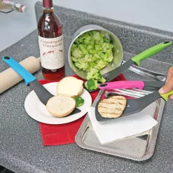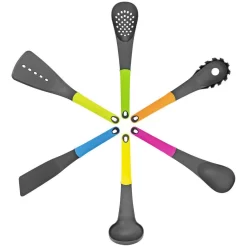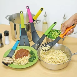 If you’re looking to fill out your kitchen drawers with all the tools needed for food prep and cooking, then you need this Kitchen Utensil Set from Southern Homewares! This set includes a spatula, ladle, spoon, turner, spaghetti server, skimmer, and stirring spoon. Each utensil is made of durable, melt-proof plastic, which allows you to use them for any cooking activity. They also all have a hole at the base of their handle for easy hanging storage, as well as colorful handles to add a bit of fun to your prep time! Whether you’re baking, meal prepping, or cooking dinner, you will no doubt be glad you have this utensil set. Order now and be sure you always have the right tool for the job on hand while in the kitchen! Stirring spoon (pink handle) measures 12.50″ x 2.75″ x 0.90″. Skimmer (dark green handle) measures 12.50″ x 2.90″ x 0.90″. Spatula (light green handle) measures 12.50″ x 3.50″ x 0.90″. Turner (blue handle) measures 12.50″ x 1.95″ x 0.90″. Ladle (yellow handle) measures 12.00″ x 3.65″ x 3.40″. Spaghetti server (orange handle) measure 12.00″ x 2.65″ x 2.85″.