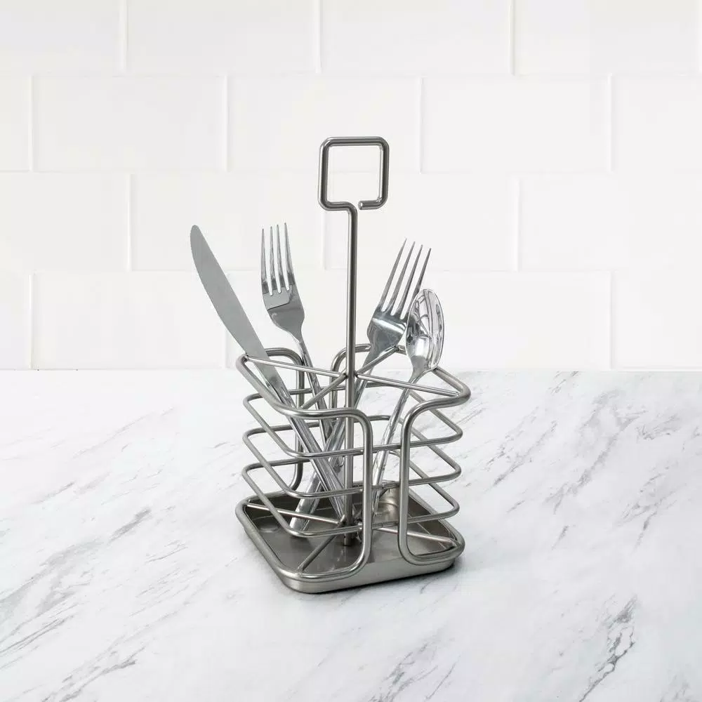 - DIMENSIONS & CARE: 10.5” H x 5” W x 5” D. Euro Silverware Caddy is made from a durable steel material. Silverware organizer is not dishwasher safe. Wipe clean with a damp cloth and thoroughly dry with towel.