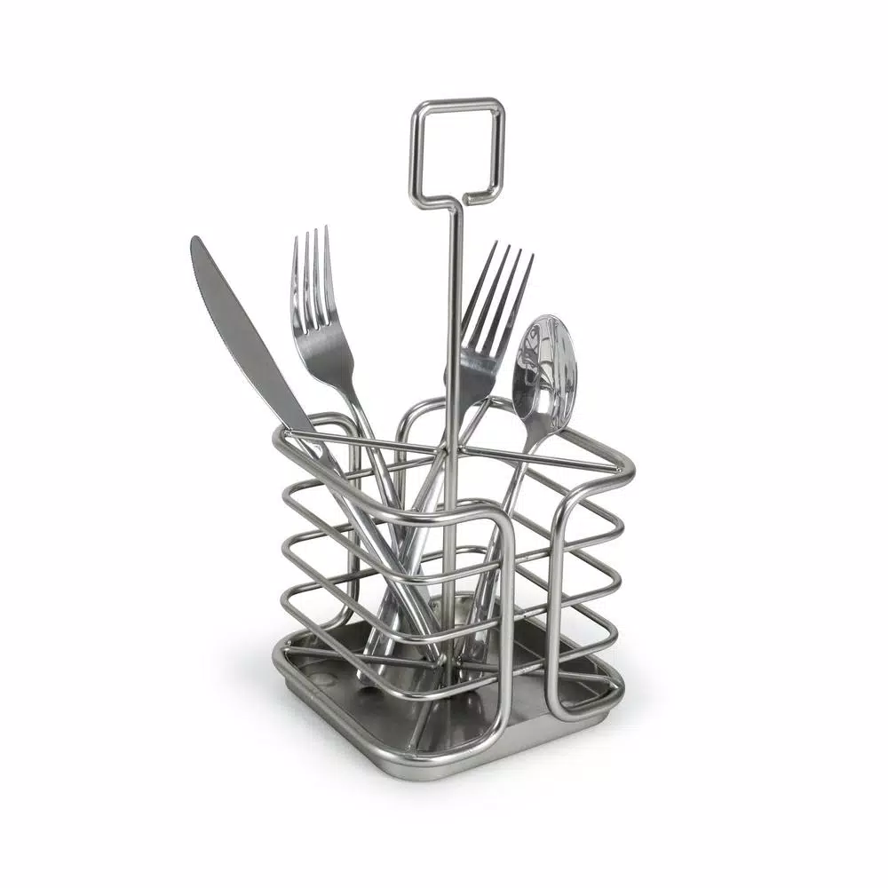 The Euro Silverware Caddy is a small utensil organizer that is perfect for small spaces or people who are on the go. Utensil holder comes with four dividers to help keep silverware in its place, even as the flatware caddy is picked up and moved around. Securely move utensil caddy from the dining room to the kitchen and back again with the attached cube handle at the top. The handle and size of the utensil holder is great for parties and buffets. Easily move around the utensil caddy as needed, without it taking up too much space at the table. In addition, the size makes it great for apartment or dorm living. It doesn’t take up too much space on counters and can be moved with ease, or even hung up on a hook. Keep silverware organized and in place, without taking up a lot of space. Holder dimensions are 10.5” H x 5” W x 5” D. The Euro Silverware Cady is made from steel material and is easy to clean. Not dishwasher safe. Wipe utensil organizer clean with damp cloth and dry with a clean towel.