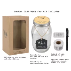 - Complete kit top shelf bucket list wish jar kit comes with 100-wish tickets, pen, rewritable twine hung plaque, and decorative lid