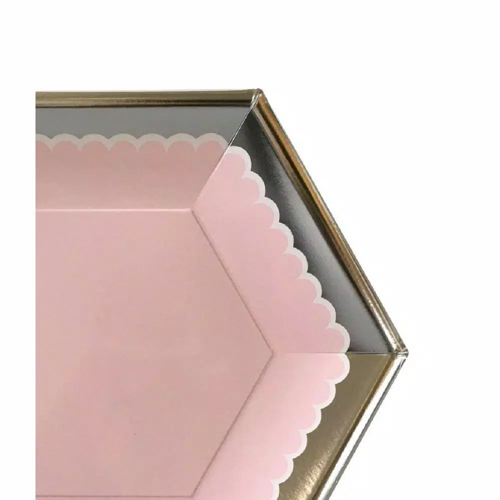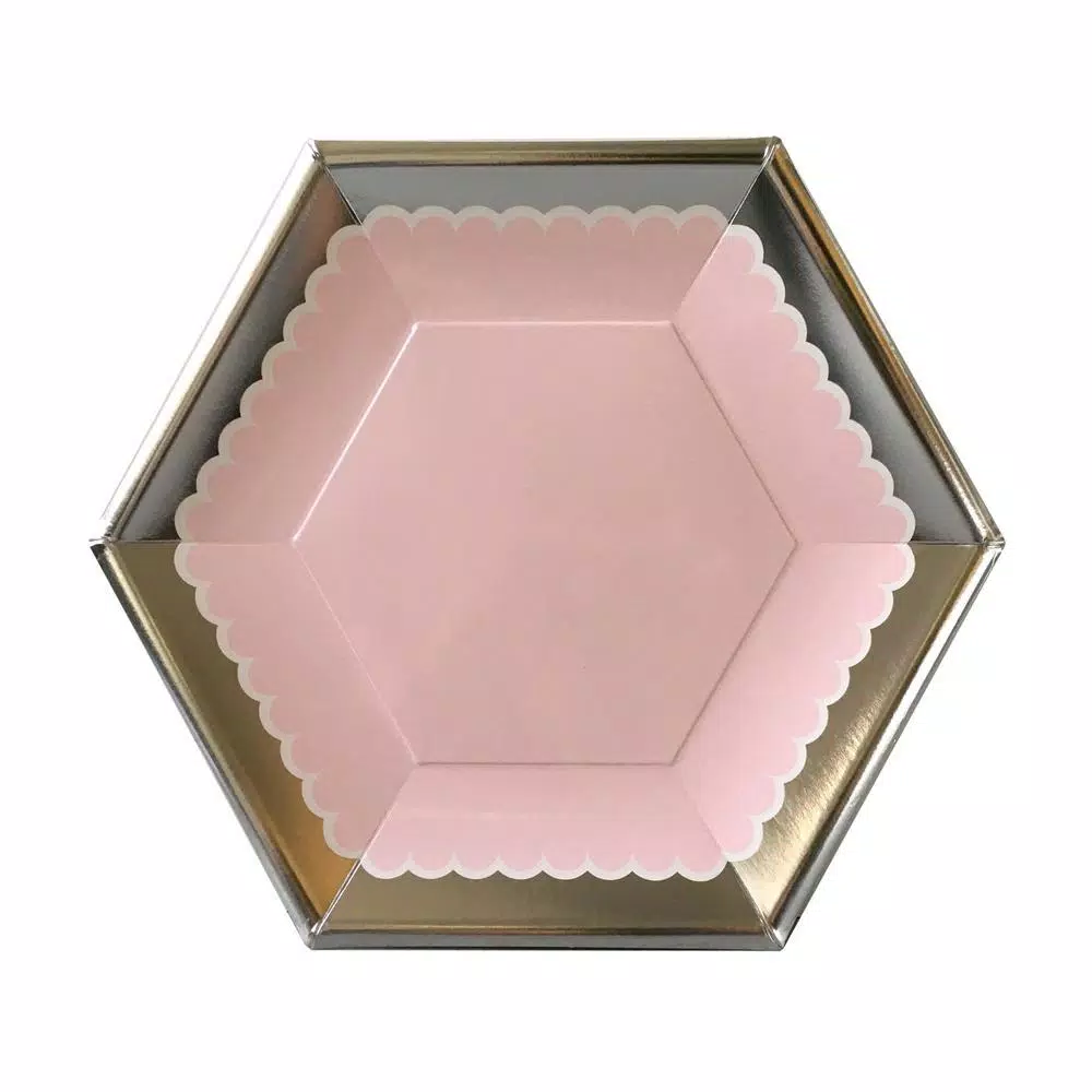 These classic hexagon shaped blush pink beauties have a metallic silver rim and will make you want to host a fancy party or event at the first change you get, and add a touch of elegance to any event. No one will believe these are paper as they look like fine dinnerware. Impress your guests for a beautiful brunch, boat party, Picnic, New Years, BBQ, Mother`s Day, garden party, birthday, and more. Your guests will not believe that these are paper plates. .Package includes 16-paper Dinner Plates from the SugarPlum Collection.