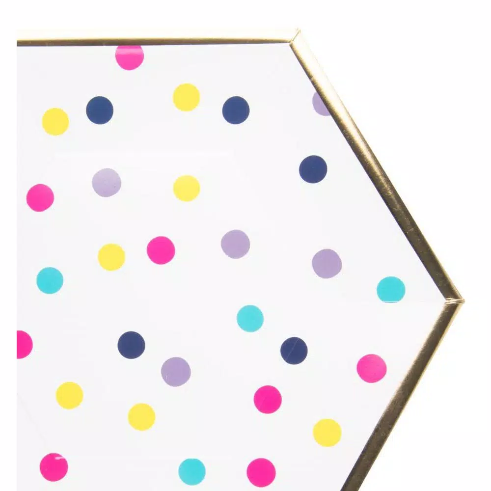 These classic hexagon shaped multicolor polka dot beauties have a metallic gold rim and will make you want to host a fancy party or event at the first change you get, and add a touch of elegance to any event. No one will believe these are paper as they look like fine dinnerware. Impress your guests for a beautiful brunch, birthday party, boat party, Picnic, New Years, BBQ, Fathers Day, garden party, birthday, and more. Your guests will not believe that these are paper plates. Package includes 16-paper Dinner Plates from the SugarPlum Collection.