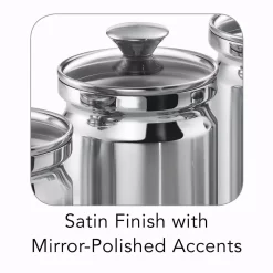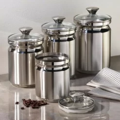 Enjoy convenient and stylish storage with this elegant glass covered stainless steel 4-piece canister set! The exclusive Tramontina gourmet 18/10 Stainless Steel 4-piece canister set features airtight, heat and shatter resistant tempered glass lids with stainless steel rims and silicone gaskets for a secure seal. The glass covers allow you to readily view the contents without lifting the lid. These canisters help keep food fresh and since they’re made of durable, easy-to-clean, premium 18/10 stainless steel won’t impart flavor onto your food. The canisters have a fine satin exterior finish with matching 18/10 stainless steel knobs plus a mirror accent border, adding a touch of decor to your pantry. The canisters come in 1.25, 1.75, 2 and 3-Quart sizes. Made in Brazil, assembled and packaged in the USA and offered under lifetime warranty. Part of the Tramontina Gourmet Collection of premium products engineered and manufactured with the finest design, materials and workmanship, outperforms similar products within the market and delivers the best quality and value to the cooking professional and enthusiast alike!