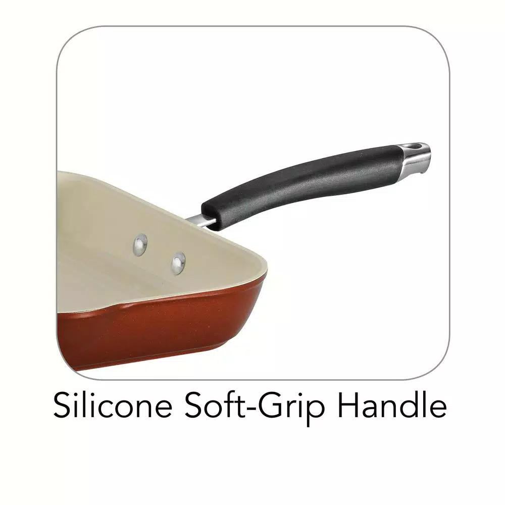 The Tramontina Style Ceramica 11 in. Square Grill Pan in Metallic Copper has a ceramic cooking surface that provides an innovative and simply healthy cooking experience, while delivering effortless cleaning and outstanding durability. Its square shape is perfect for burgers, steak, fish, and other proteins. Part of the Tramontina STYLE collection, a series of on-trend fusion of quality, design and value.