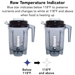 - Thermo-chromatic ink raw-temperature indicator printed on the side of the blending container changes from blue to white when the temperature reaches 118°F so you can easily keep track of the temperature of your blend