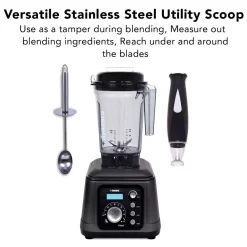 - Stainless steel utility scoop is more functional than a rubber tamper that comes standard with other blenders, with its unique shape that allows you to scoop out blends even under the blades and can even be used during blending. Our design allows you the option of blending with or without the seperate vacuum funtion allowing for maximum function