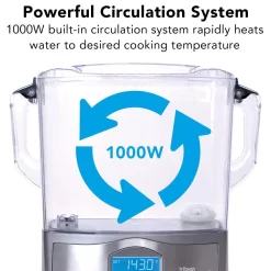 - Powerful 1000-Watt built-in circulation system rapidly heats water to desired cooking temperature to 0.1°F without the need to worry about minimum/maximum fill levels. The operation is quiet and simple to set up. Just add water, set the time and fill with your food product.