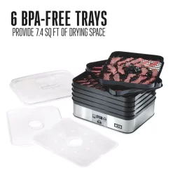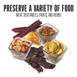 The Weston 6 Tray Digital Food Dehydrator Plus is the perfect tool to preserve foods for later use. Use to dry the season’s harvest for meats, making jerky and a variety of snacks. Ideal for making banana chips, fruit rollups, dried herbs, fruits and vegetables. The adjustable digital thermostat lets you adjust the drying temperature from 100° -160° and has a 48 hour timer with automatic shut off. The continuous air flow provides even drying for better taste. Includes one fine-mesh sheet for drying small foods like herbs and one solid sheet for making fruit roll ups.
